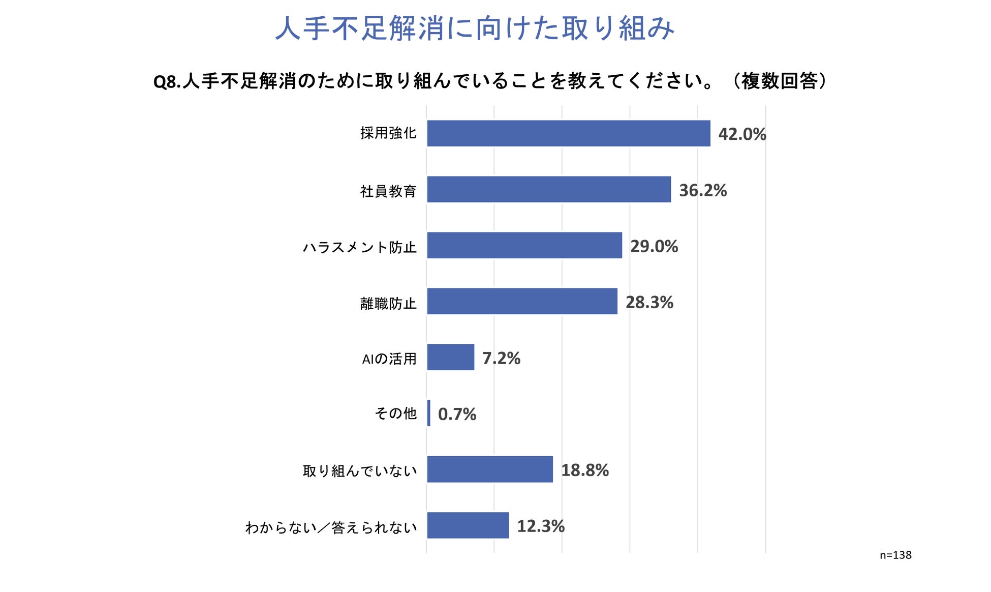 「Q8.人手不足解消のために取り組んでいることを教えてください。」と質問したところ、「採用強化」が42.0%、「社員教育」が36.2%、「ハラスメント防止」が29.0%という回答となりました。