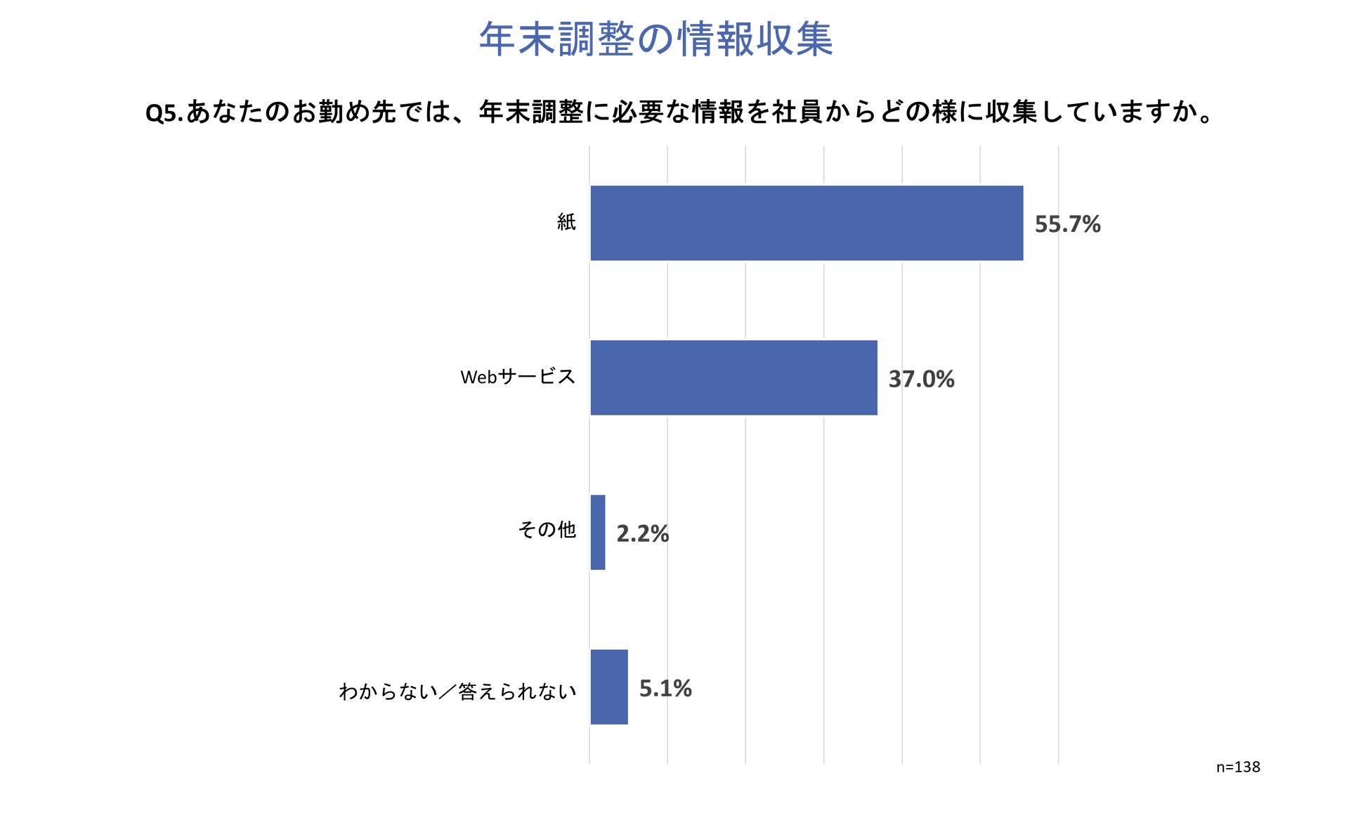 「Q5.あなたのお勤め先では、年末調整に必要な情報を社員からどの様に収集していますか。」と質問したところ、「紙」が55.7%、「Webサービス」が37.0%という回答となりました。