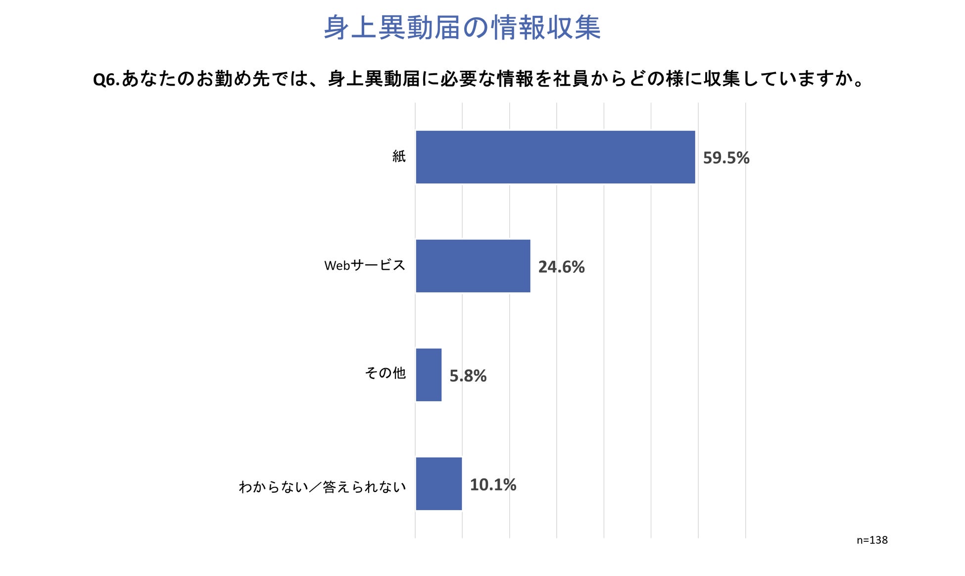 「Q6.あなたのお勤め先では、身上異動届に必要な情報を社員からどの様に収集していますか。」と質問したところ、「紙」が59.5%、「Webサービス」が24.6%という回答となりました。
