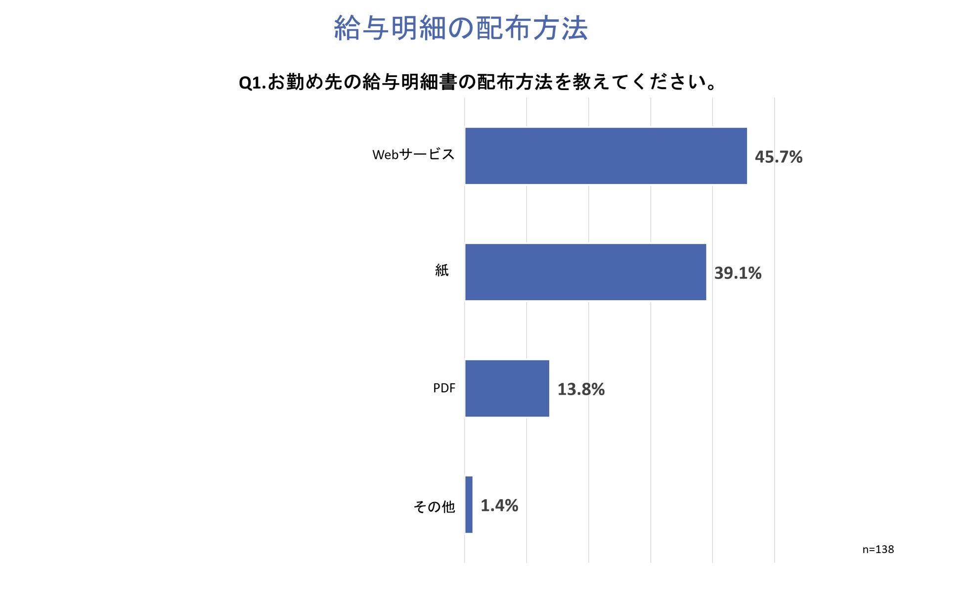 「Q1.お勤め先の給与明細書の配布方法を教えてください。」と質問したところ、「Webサービス」が45.7%、「PDF」が13.8%とデジタル的に配布している割合が約60%。「紙」が39.1%という回答となりました。