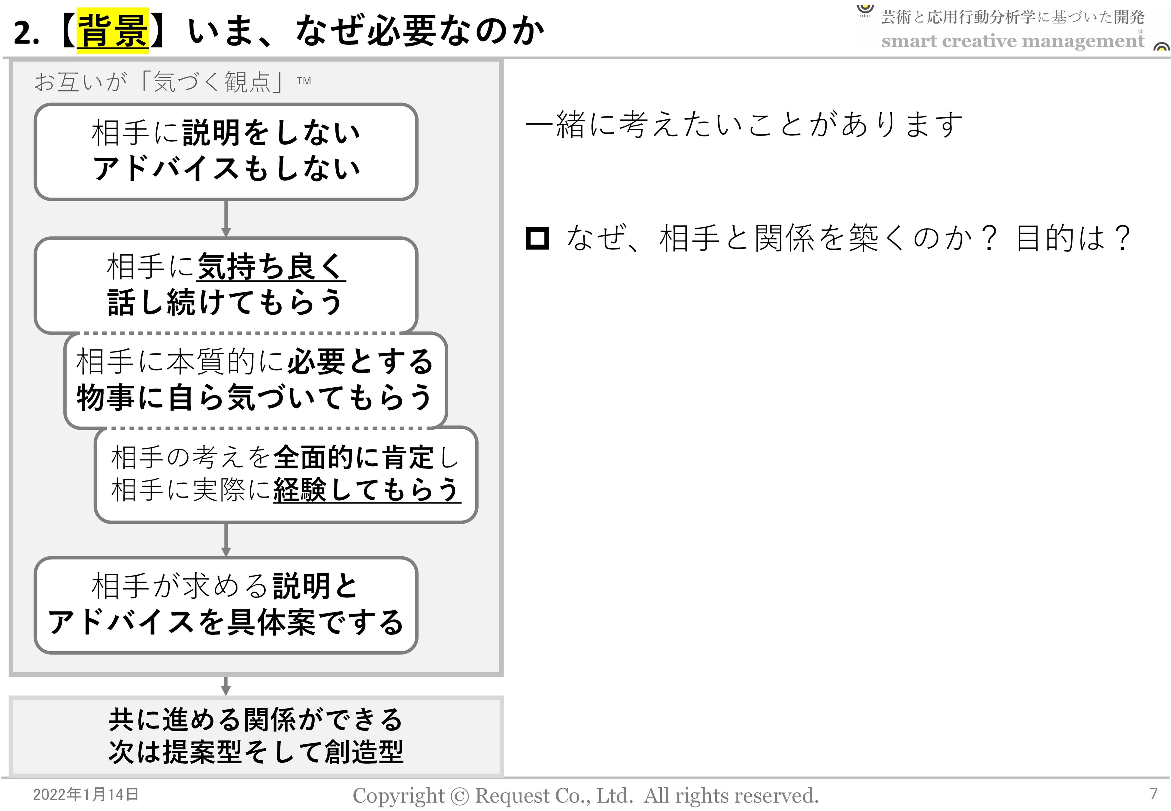 スマートクリエイティブマネジメント総合研究所とABA(応用行動分析学)オペレーションズ研究センターを構え、芸術と応用行動分析に基づいた開発: 需要創造の科学® “ smart creative management® ” を22年間をかけて開発。社員30,000人の企業から年商3億円の地域密着型企業へ提供実績を有しています。 実績は840社以上。