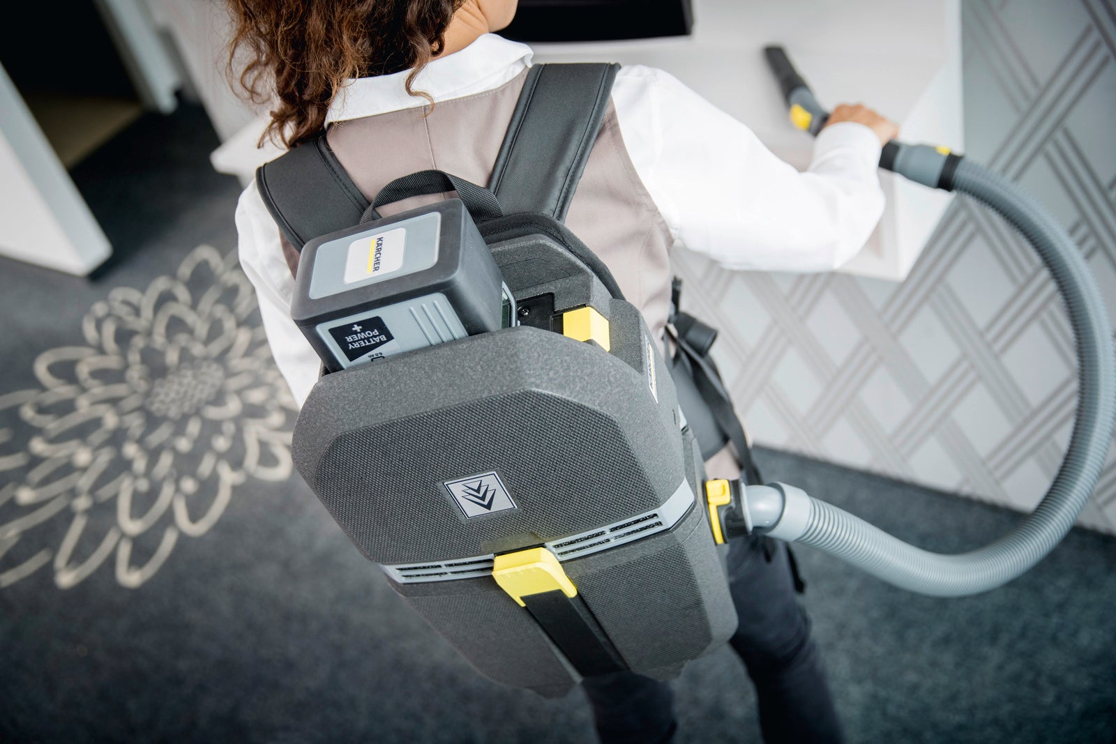 本製品は労働生産性の向上に寄与すべく、清掃作業員の身体負荷の軽減を可能とした、EPP(発泡ポリプロピレン)素材を採用した超軽量の背負い式掃除機です。ケルヒャー他製品と互換性のあるバッテリーパワープラス(リチウムイオンバッテリー)仕様とすることで、業界最高水準※の吸引性能を可能にしました。これにより、従来のコード式キャスター型の掃除機では掃除しづらかった狭い場所や段差のある場所でも簡単に作業ができ、清掃作業員の安全性にも貢献します。(※自社調べ)