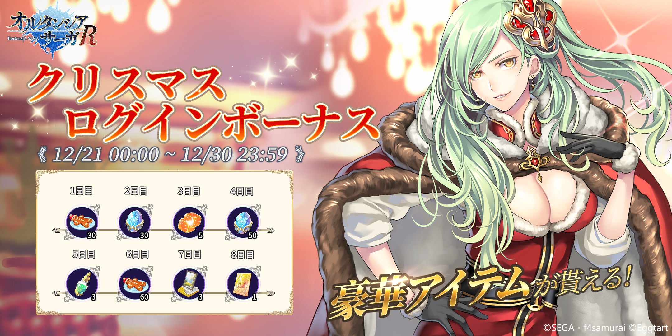“クリスマスログインボーナス”は、期間中8日間ログインするだけで、イベント“聖夜に響く黒鉄の羽音”で使用できる限定アイテムや聖王石などを獲得することができます。