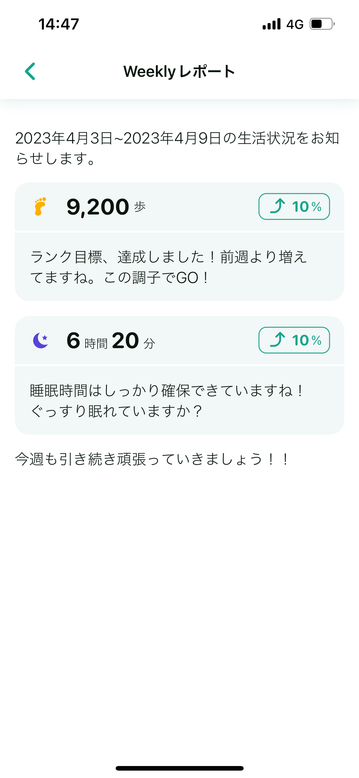 「Apple Watch」で記録した歩数と睡眠時間は、「iPhone」の「YORiSOS」でホーム画面に表示。厚生労働省が定める毎日の推奨歩数と睡眠時間の目標値に対する達成度も示すことができます。1週間分の結果は「Weeklyレポート」として通知されるほか、「Apple Watch」または「iPhone」のデータから不規則な心拍、激しい転倒、歩行の安定性の低下の症状がみられる場合は「セコムアシストレポート」を通知して気づきを与え、早めの相談や対策を促します。セコムの看護師に電話で健康相談ができる「ほっと健康ライン for YORiSOS」を通じて、アドバイスを受けることも可能です。