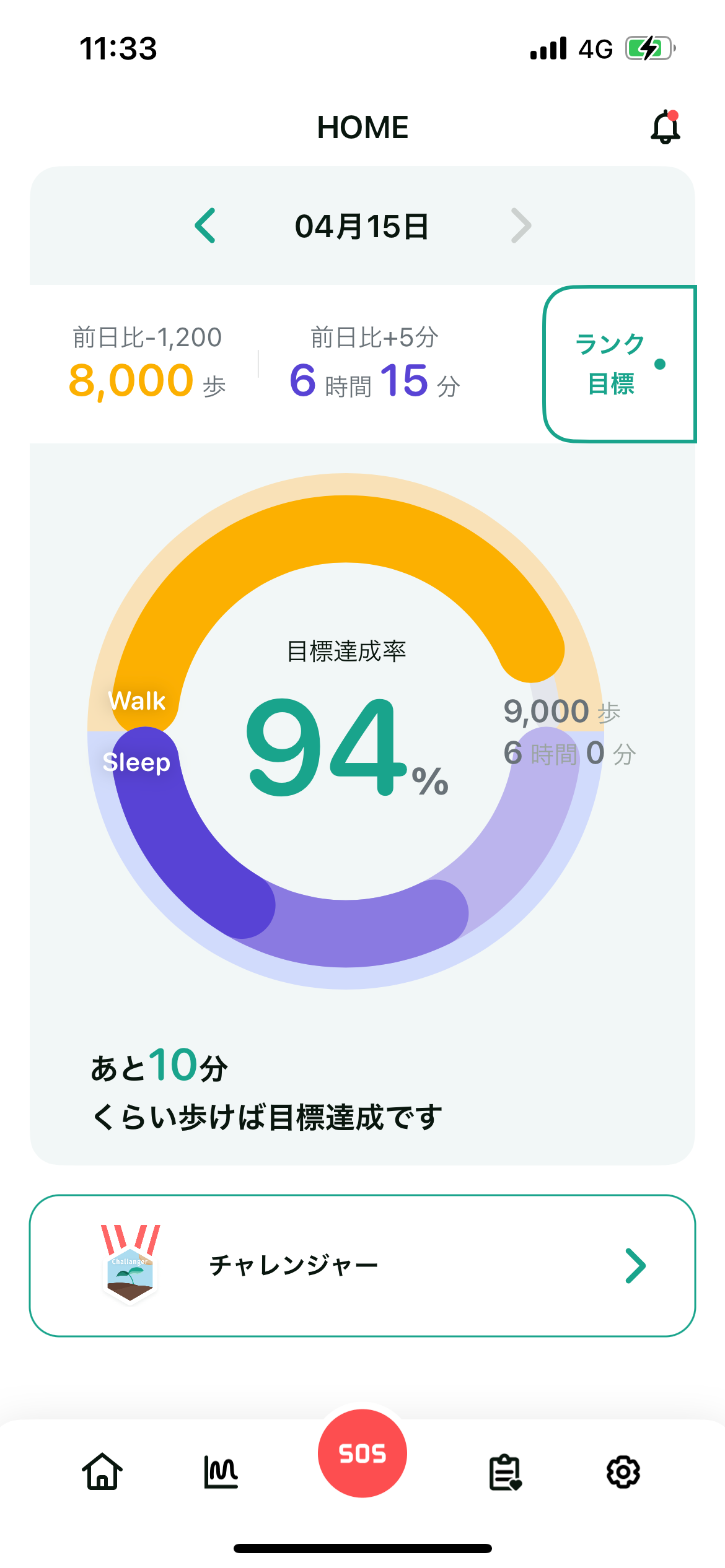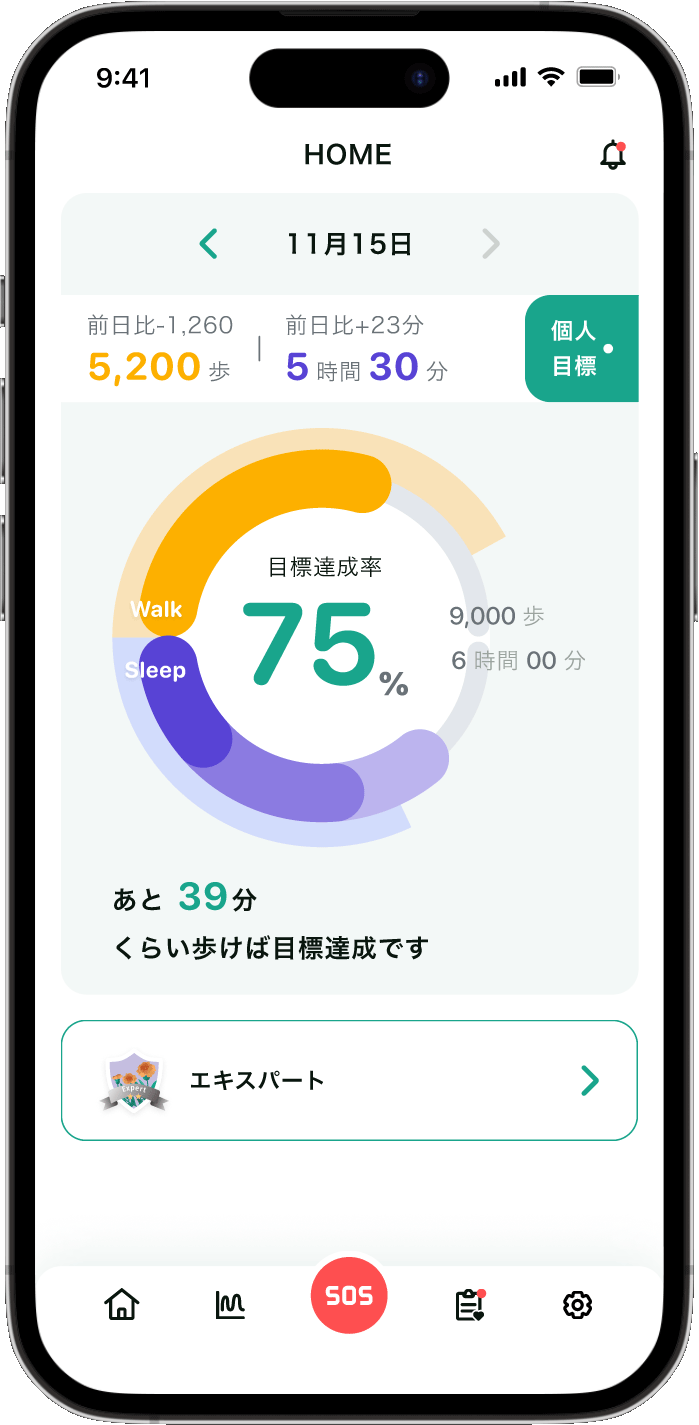 健康管理では、「Apple Watch」で記録した歩数、睡眠時間のデータを表示※3。厚生労働省が定める毎日の推奨歩数と睡眠時間の目標値に対する達成度が「YORiSOS」に表示されます。1週間分の結果がレポートとして通知されるほか、「Apple Watch」または「iPhone」のデータから不規則な心拍、激しい転倒、歩行の安定性の低下がみられる場合は早めの相談や対策を促し、日常の健康管理をサポートします。