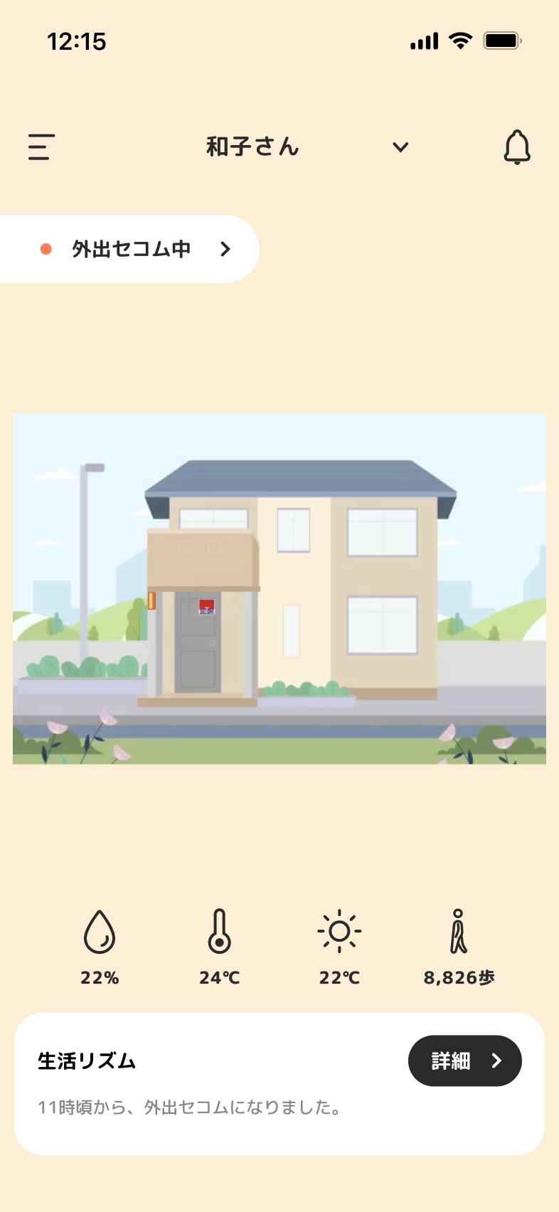 ※「セコム・ホームセキュリティ」のオプション「安否みまもりサービス」で利用できるアプリで、親御さんのご自宅に設置した防犯センサーの検知情報を蓄積し、分析した結果から生活リズムやセンサー検知回数などを確認できます。データの共有については、ご利用者からの許可が必要で、ご利用者が承認した家族間のみで共有されます。セコムはこれらの情報にアクセスすることはありません。