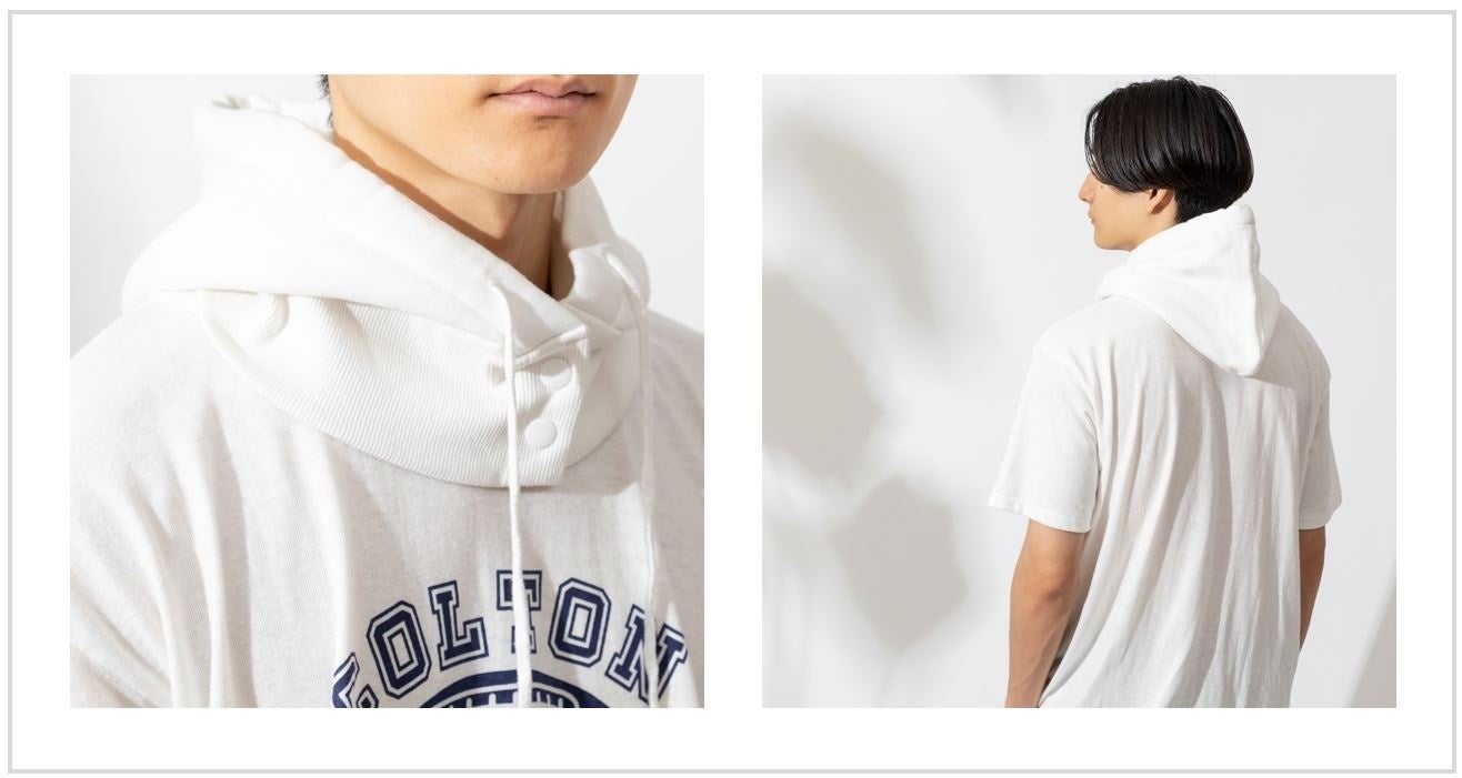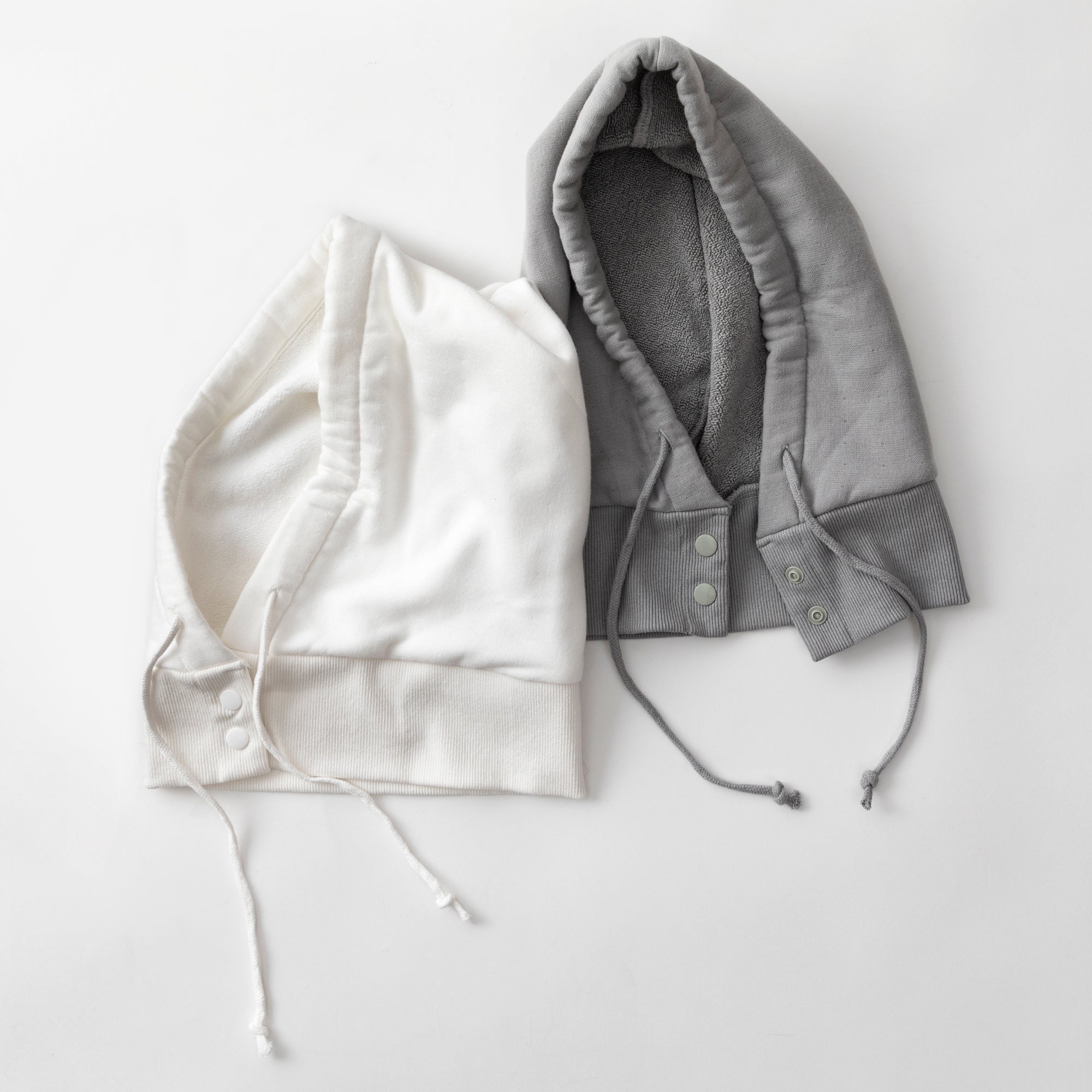 サウナやジムのあと、ドライヤーで髪を乾かす手間を省きたい。ただ、髪が濡れたままだと服が濡れてしまう、湯冷めしてしまう、タオルを首に巻いて帰るのは気恥ずかしい、という声から誕生したアイテムです。シンプルなフーディですが、内側はタオル素材、外側はガーゼ素材を使用したダブルフェイス仕様。首回りはリブ仕立てにし、ドットボタンをつけました。吸水性抜群の素材は濡れた髪の水分をしっかり吸収し、髪がある程度乾いたらボタンをして後付けフードとしても使えます。