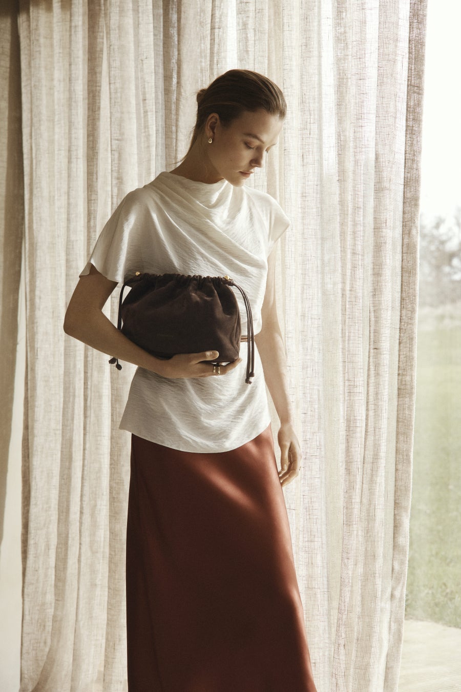 エフォートレスな洗練を体現するスエードバッグは、上質なイタリアンカーフスプリットスエードを使用した、滑らかな手触りとタイムレスな魅力を兼ね備えています。