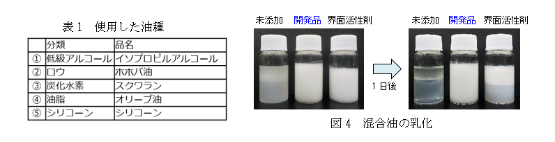 一般的な乳化では、界面活性剤の作用が異なるため、油種ごとに界面活性剤の選定が必要です。一方、本開発品は油種に関係なく強い乳化作用を持ちます。異なる5種の油(表1)を等量ずつ配合した混合油を準備し、水:混合油=1:1の割合で、終濃度が3wt%になるように本開発品を添加し、ミキサーで撹拌混合しました。1日静置後の乳化状態を図4に示します。界面活性剤では分離が見られるのに対して、本開発品では1か月以上、乳化状態を維持しています。