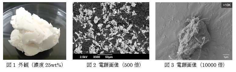 本開発品は表面が繊維化された直径7μm程度のセルロース粒子で、水分散体として提供します。表面が繊維化されていることで、その比表面積は70m2/gと、市販のセルロース粉末や結晶セルロースの約20倍にもなり、各種溶媒への分散安定性が向上します。また、複数混合油の一斉乳化や充填結合剤としての利用など、CNFとは異なる用途展開が期待されます。