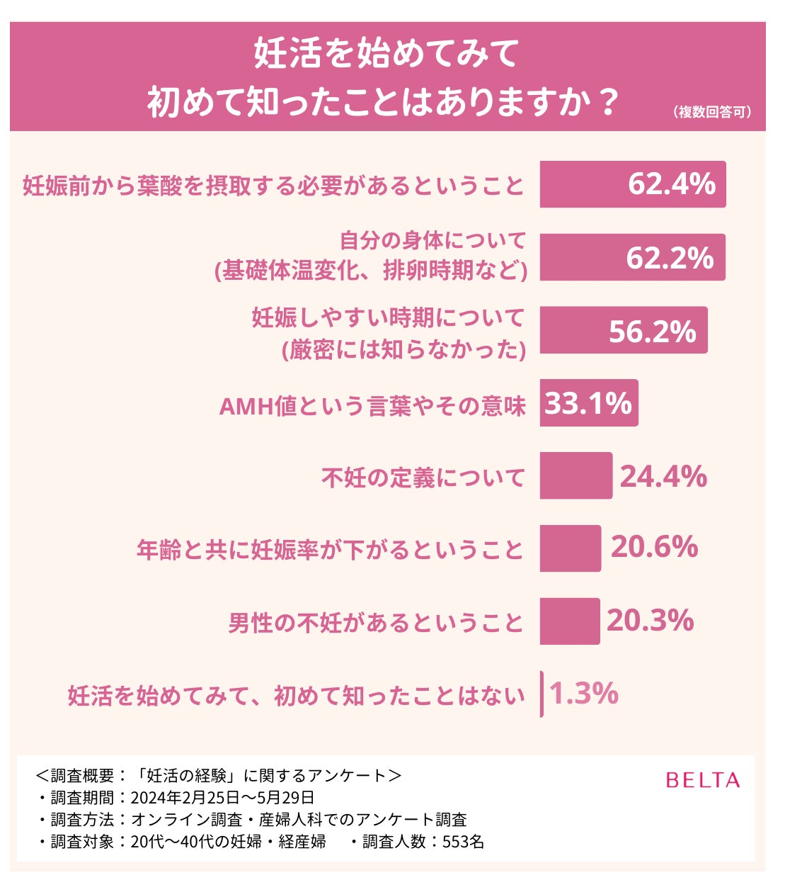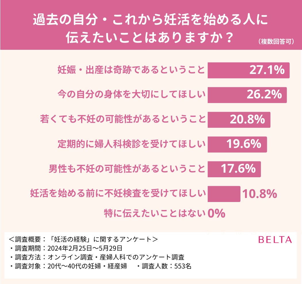 BELTAでは、こうした声を受けて、妊娠・出産経験のある女性553名を対象に、自身の妊活経験を振り返っていただくアンケートを実施しました。