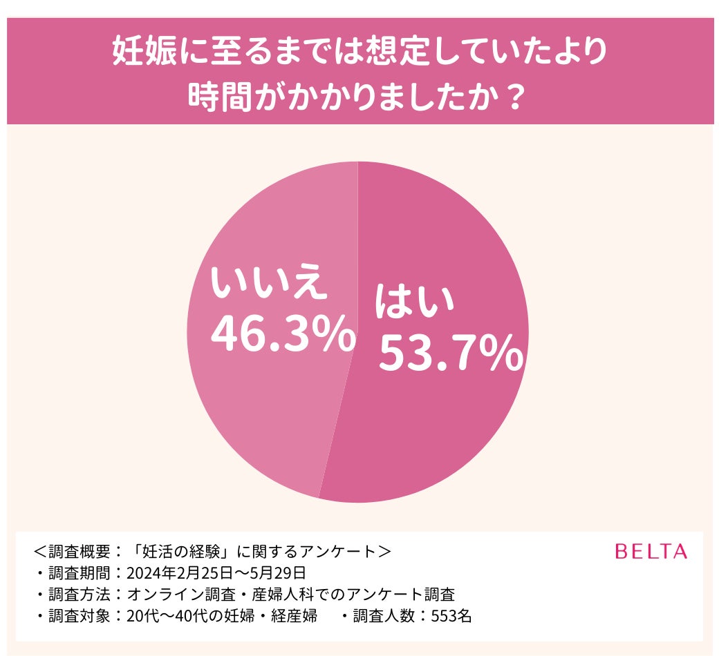 「妊娠に至るまでは想定していたより時間がかかりましたか?」という質問に対し『はい』と答えた人は53.7%いました。
