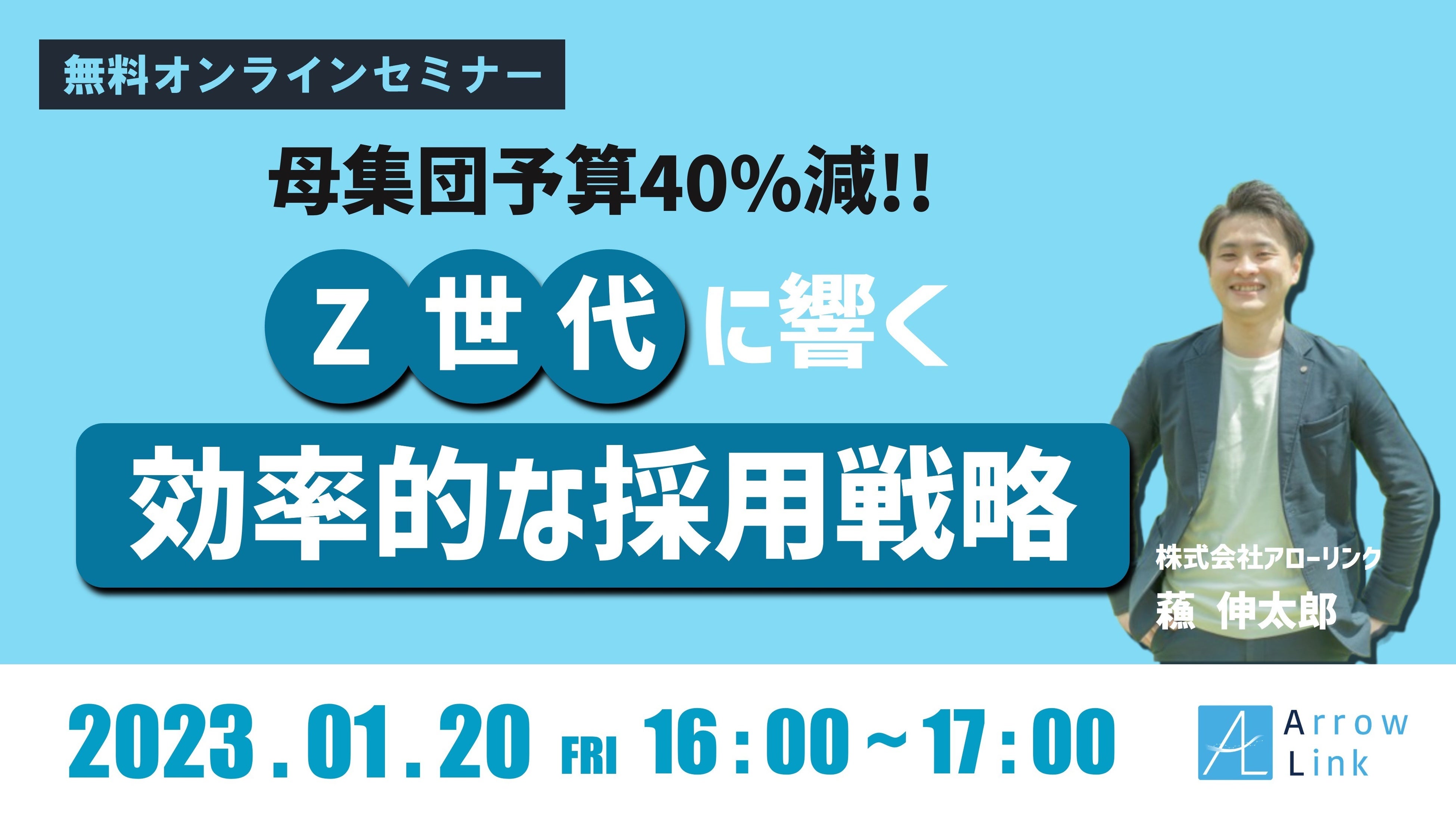 株式会社アローリンク(本社:兵庫県神戸市、代表取締役:蓬莱和真)は、2023/01/20(金)に無料のオンラインセミナーを開催します。「母集団予算40%減!Z世代に響く効率的な採用戦略」と題し、Z世代に有効な採用方法と母集団形成に必要な予算を削減する秘訣を詳しくお伝えします。