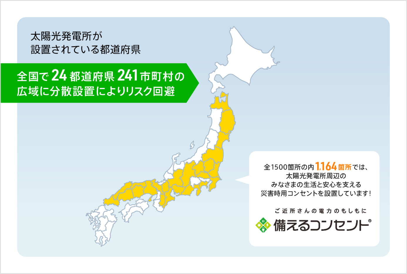 合計1,500箇所のNon-FIT太陽光発電所は、全国で24都道府県241市町村の広域に分散設置しており、発電所ポートフォリオとして天候による発電量の変動の抑制、災害等のリスク分散を図っています。