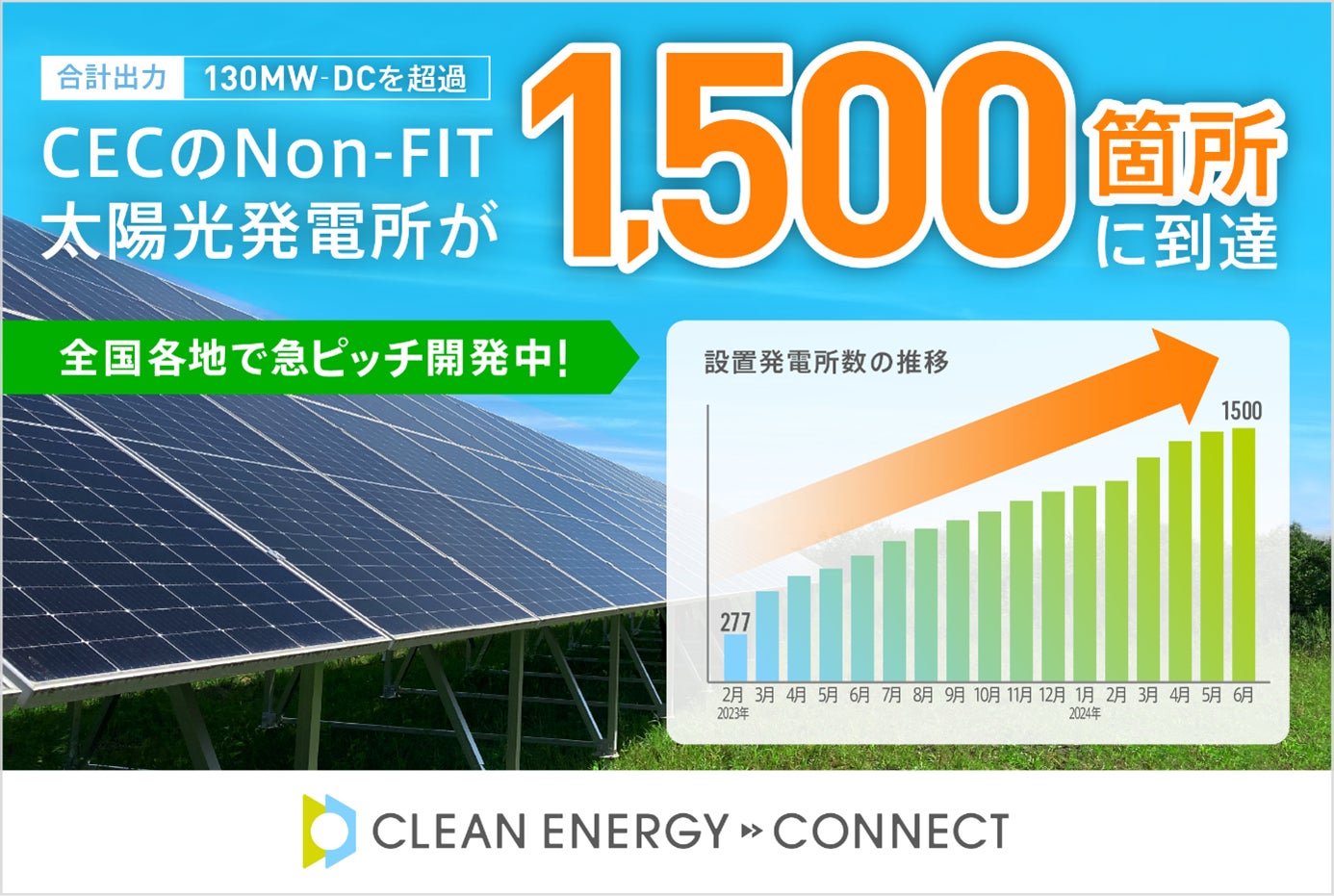脱炭素経営企業、RE100参加企業等のお客様に対してNon-FIT太陽光発電によるグリーン電力と環境価値をお届けする株式会社クリーンエナジーコネクト(代表取締役:内田鉄平、以下「クリーンエナジーコネクト」)は、発電を行っているNon-FIT太陽光発電所が、合計1,500箇所になりましたのでお知らせします。