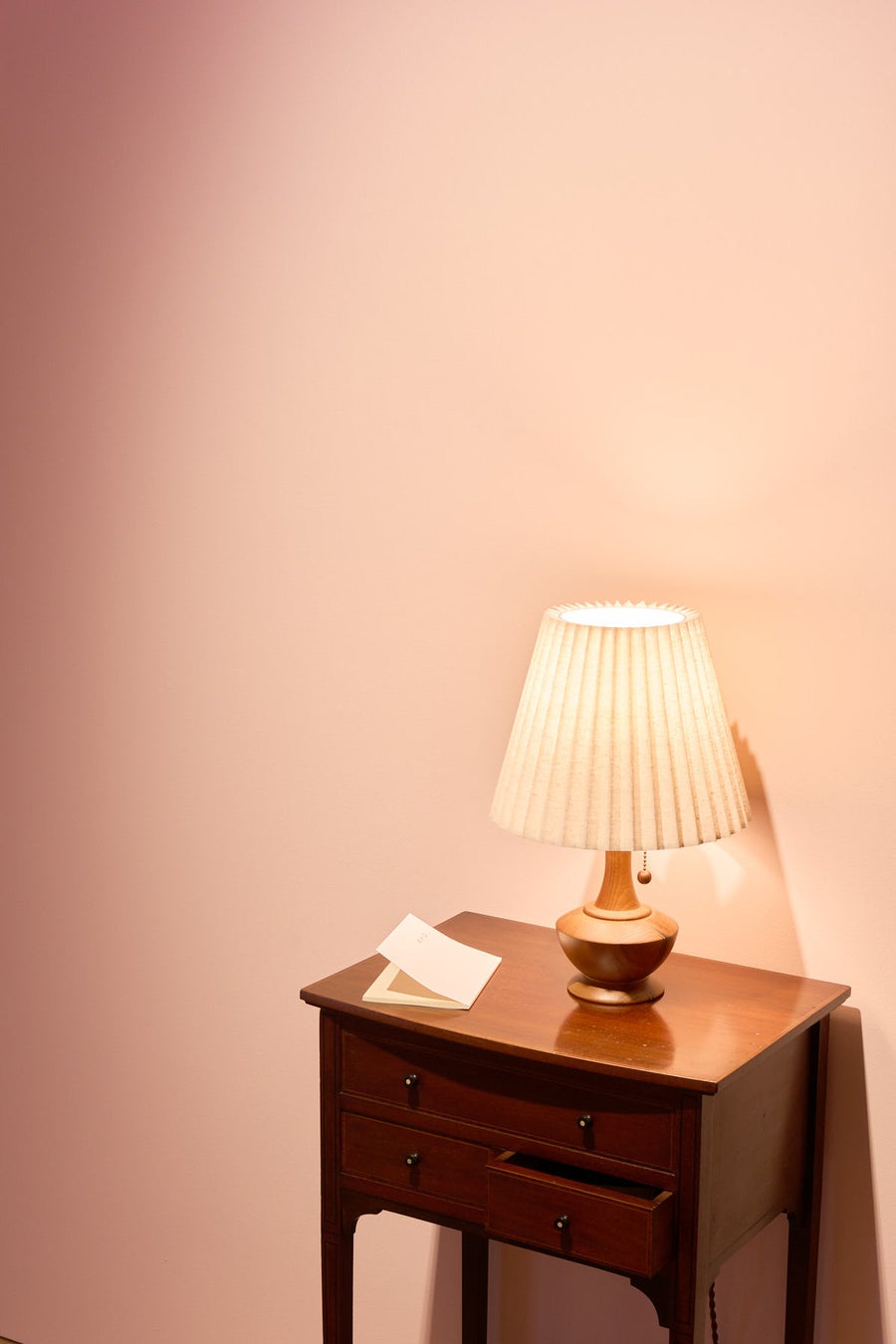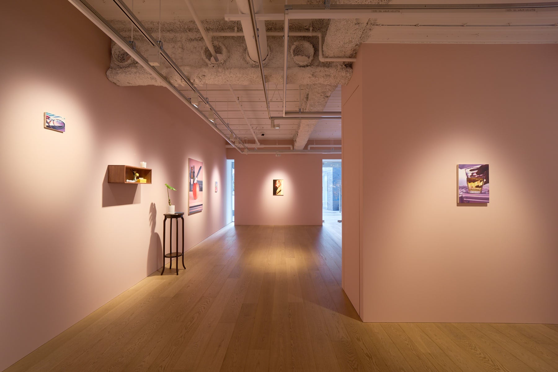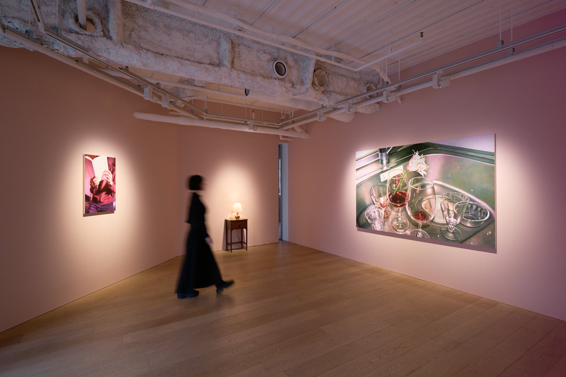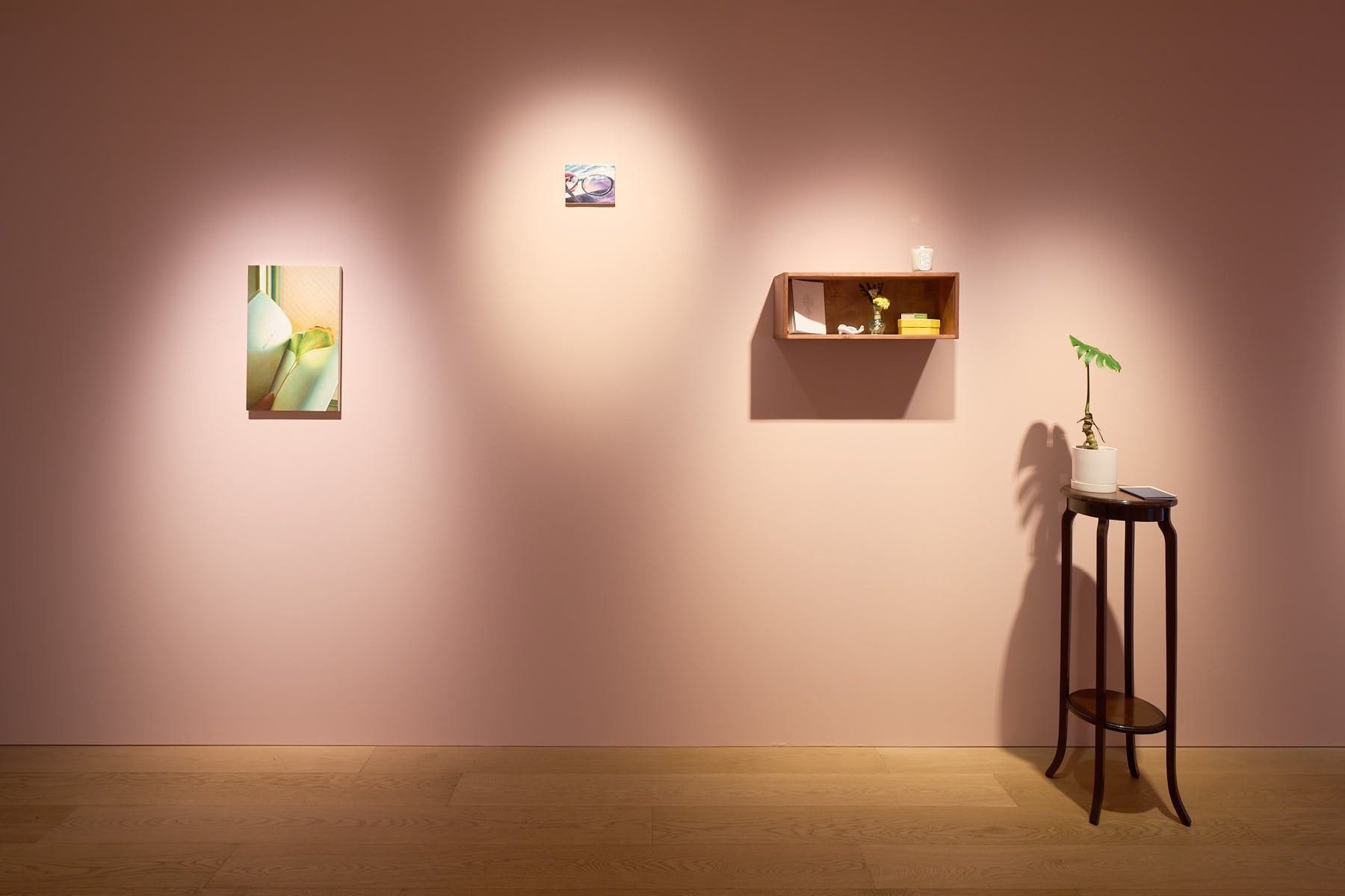 これまでの松川の展示は主に、ニュートラルなホワイトキューブにて鑑賞者が作品へと導かれていくような構成でした。本展では親しみを込めたピンクベージュの壁に囲まれた、まるで誰かの部屋のようなクローズドな空間を展開しています。その中で鑑賞者は、空間の内側に包み込まれる体験とともに松川の織りなすストーリーにいつの間にか引き込まれるでしょう。