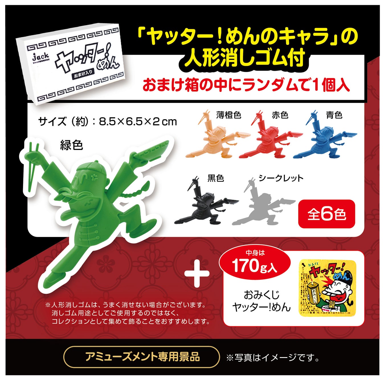 コレクション性◎ ヤッター!めんキャラの人形消しゴムは、全国のゲームセンターやオンラインクレーンゲームでしか手に入らない“アミューズメント限定”のおまけです♪