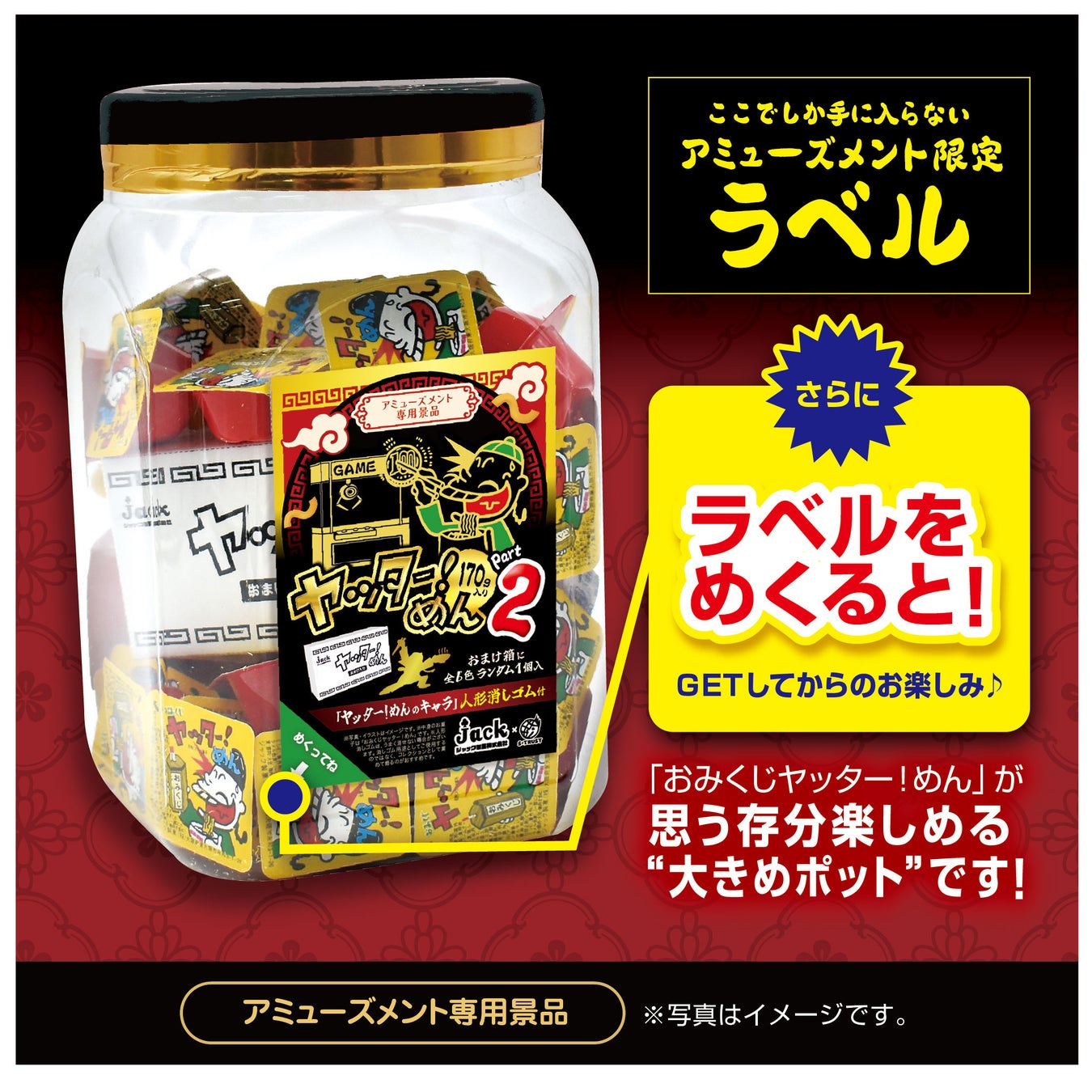 お待たせしました!★第2弾★「ヤッター!めん」キャラの人形消しゴムがおまけで付いた “おまけ箱入りオリジナルポット” がアミューズメント施設限定で登場!さらにラベルをめくると…GETして要チェック♪