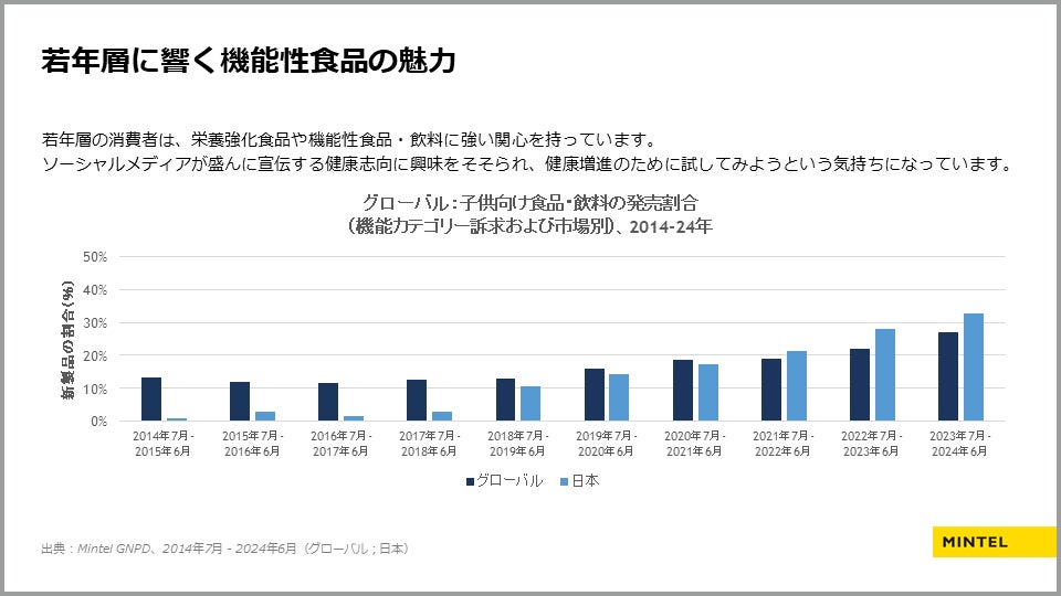 本講演では、世界各国でトレンドになっている機能性食品・飲料を取り上げ、これから日本でも流行となりえる事例をご紹介しました。さらに、ミンテル世界新商品データベース(GNPD)およびミンテル独自の消費者データを基に、機能性食品・飲料の発売が世界的に増加する中、子ども(α世代)からZ世代、中年層~シニア層までさまざまな年齢層に特有の健康ニーズに世界各国の製品がどのように対応しているかを解説しました。