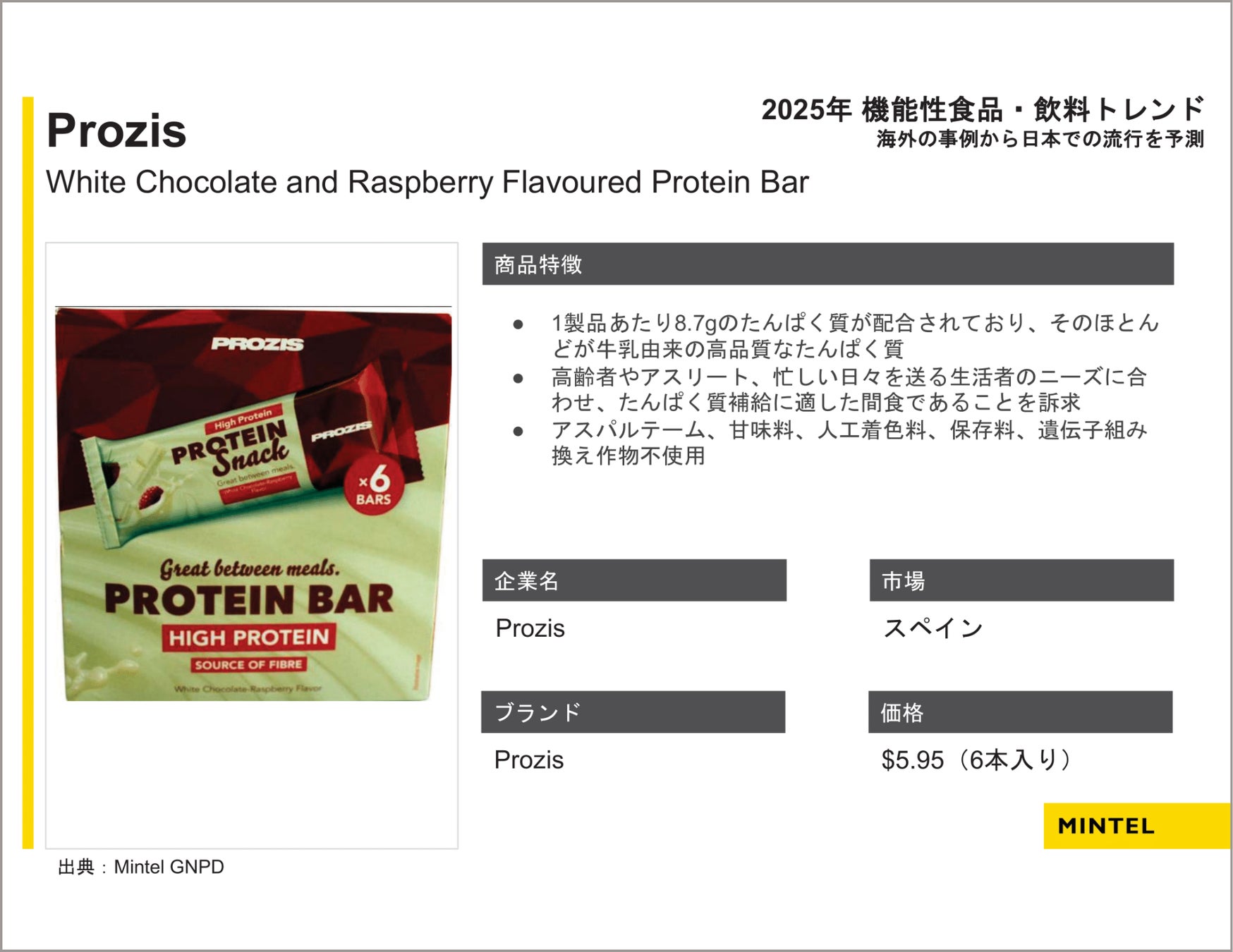 また、ミンテル世界新商品データベース(GNPD:Global New Products Database)に登録されている商品の中から、こういったシニア世代もターゲットにしているスペインのプロテインバー、Prozis White Chocolate-Raspberry Flavoured Protein Barを紹介しました。