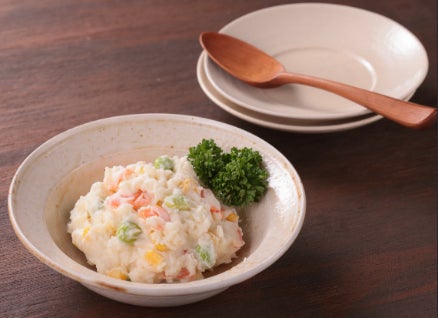 じゃがいもをメインに、人参、玉ねぎ、枝豆、コーンの5種類の具材を使った、具だくさんで手作り感のあるサラダに仕上げました。