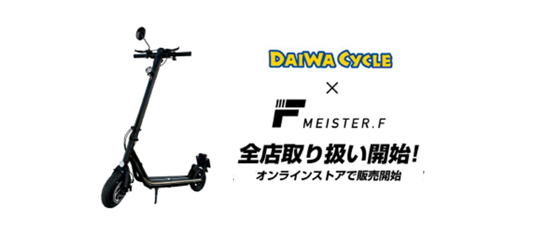 自転車の「新しいアタリマエ」を創る自転車専門店、DAIWA CYCLE株式会社(所在地:大阪府吹田市、代表取締役:涌本宜央)は、公道走行が可能な電動キックボード「MeisterF(FUGU INNOVATIONS JAPAN社製)」の取り扱い店舗を拡大して全102店舗に試乗車を常設いたしました。ぜひ、この機会にダイワサイクルにお立ち寄りください。