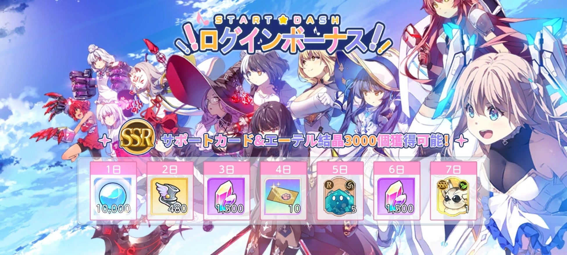 ゲームを始めた方全員に、最大7日間、スタートダッシュログインボーナスとして、「エレス」や「スタミナ」、また召喚に使える「エーテル結晶」3,000個など豪華なログインボーナスを配布!7日目には、SSRサポートカードの「化狐」が獲得できます。