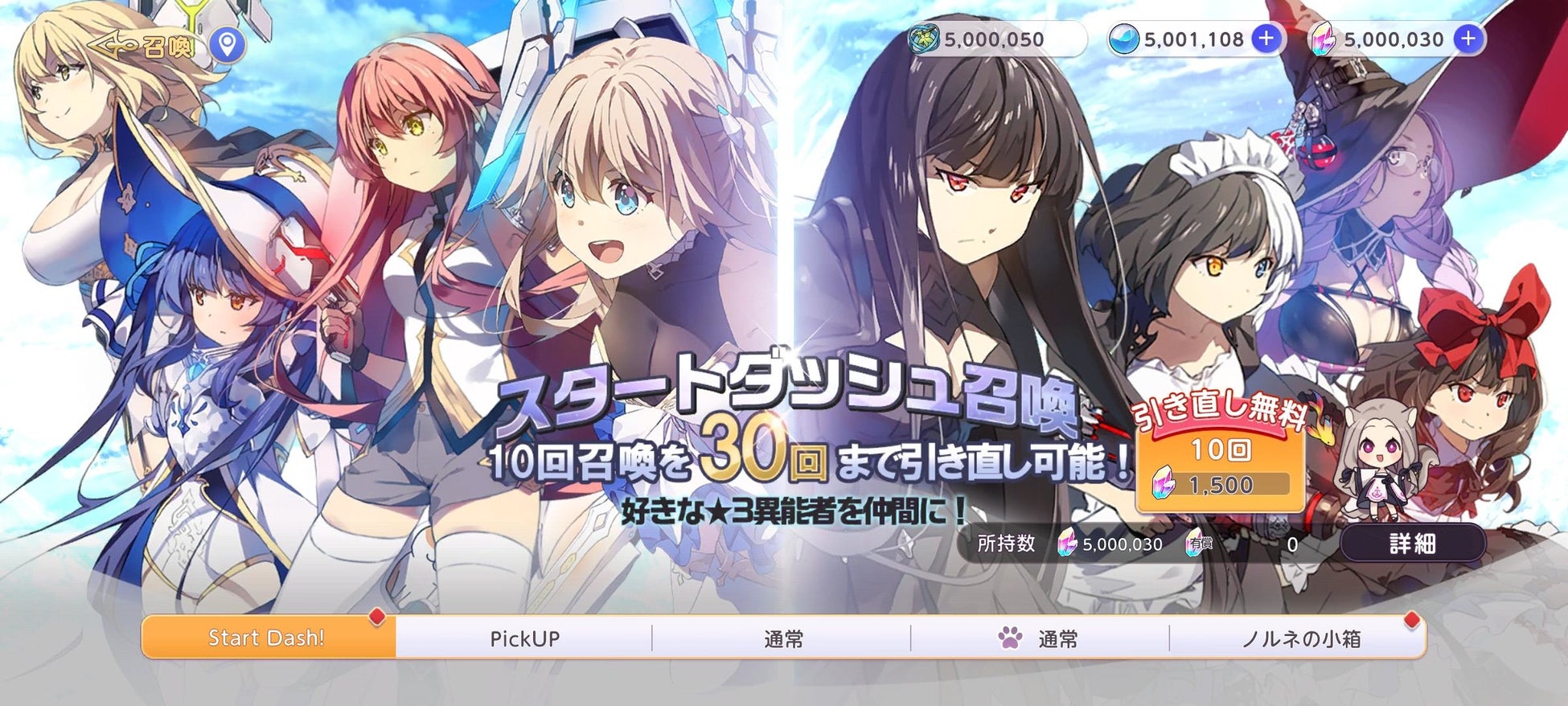 1-4のチュートリアルを突破後、“入学祝い”として「スタートダッシュ召喚」を無料で引くことができます。10連召喚を引き、もし結果が気に入らなかった場合は最大30回まで引き直しが可能です。毎回必ず星3異能者(キャラクター)(※)が1体排出され、さらに結果を1回分保存できるため、それ以降の結果と比較して一番気に入ったものを手に入れることができます。※ガチャ排出時最高レアリティ
