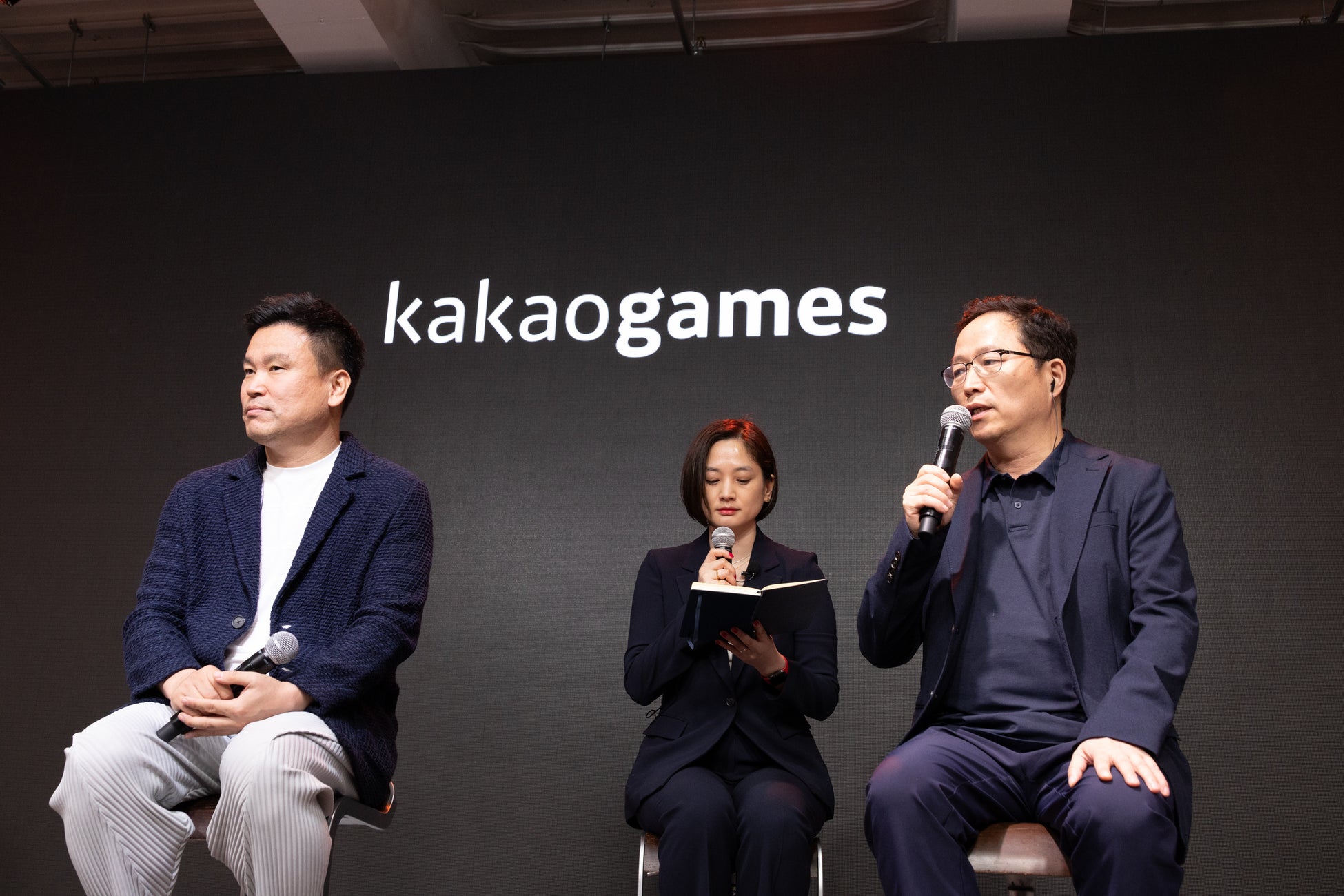 ▲開発社LIONHEART STUDIOのキム・ジェヨン代表、パブリッシャーのカカオゲームズのチョ・ケヒョン代表のトークセッション