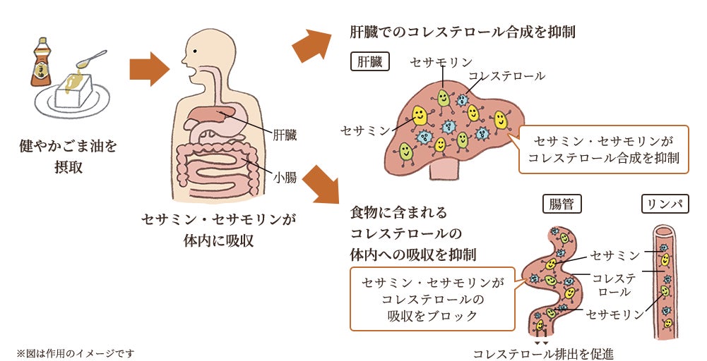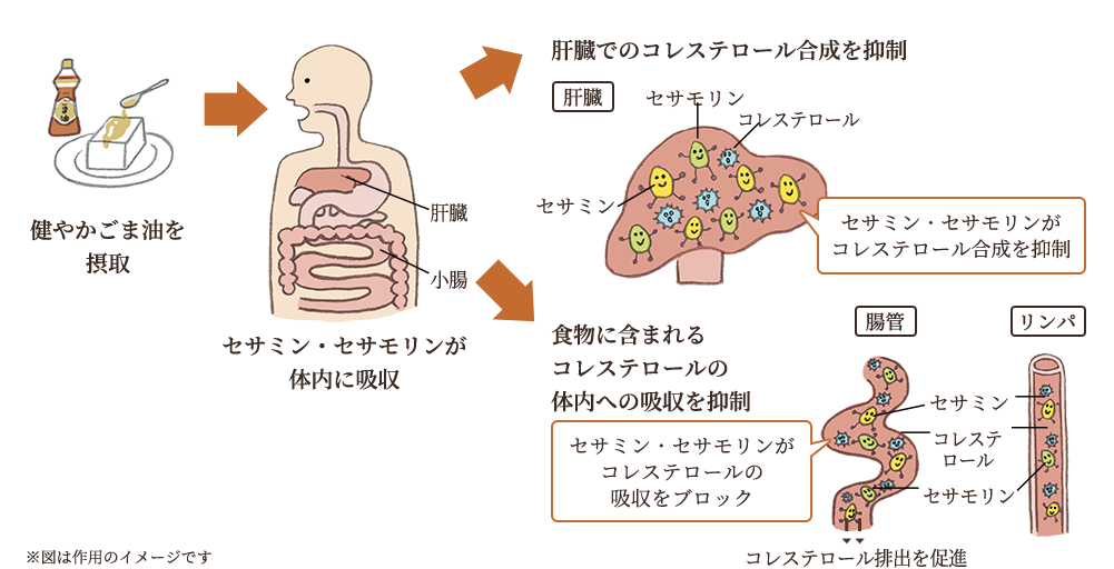 ごまの特徴的な成分セサミン・セサモリンの働きにより、{血清LDLコレステロールを減らすのを助ける}効果があります。