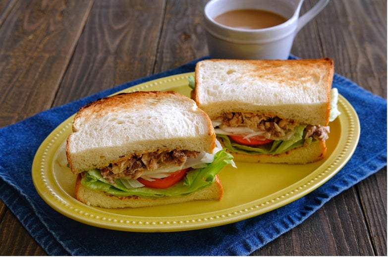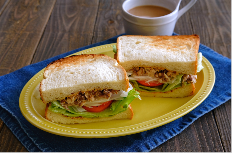 ③ 1枚のパンに、ちぎったレタス、トマト、玉ねぎ、①のさばの順に半量ずつのせ、もう1枚のパンで挟み、