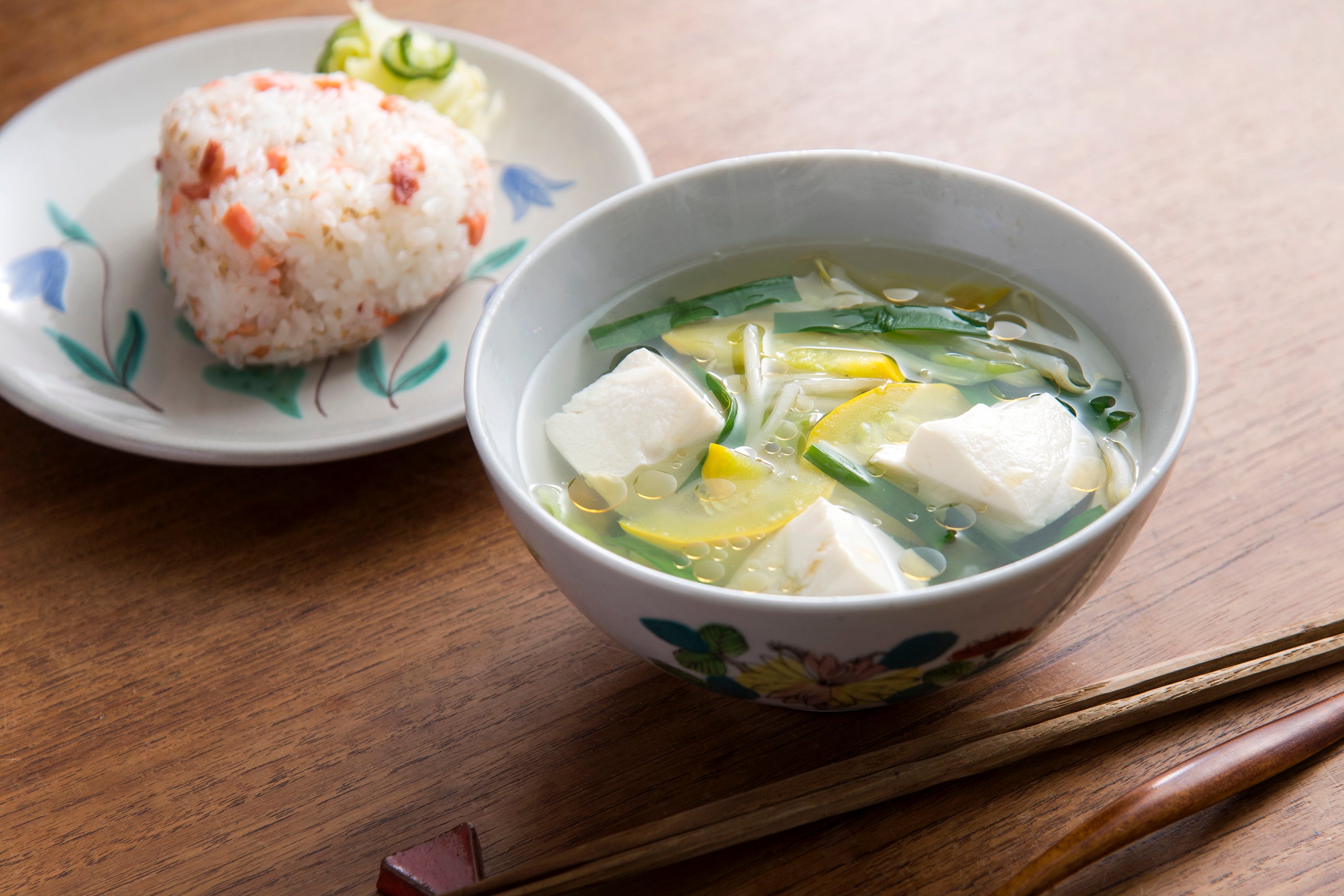 ② 鍋に鶏スープを入れて塩を加えて温め、①のキャベツ、もやし、ズッキーニを加える。豆腐をスプーンですくって加える。野菜に火が通って豆腐が温まったらニラを加え、味をみて薄ければ塩(分量外)、こしょうを加えて火を止める。器に盛って健やかごま油を回しかける。