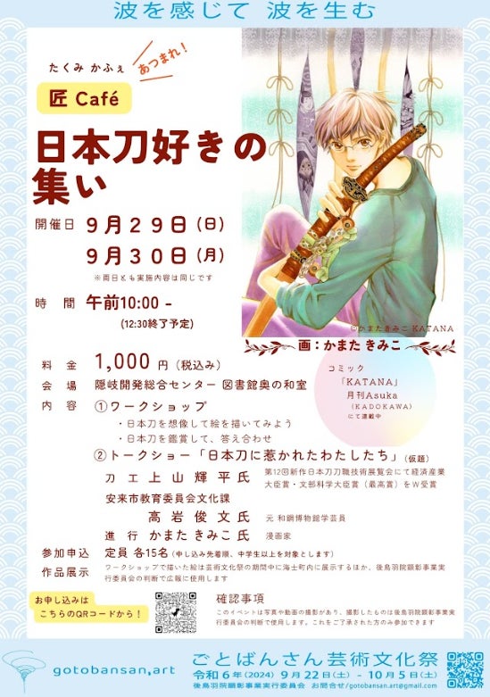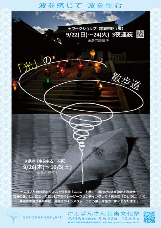 芸術文化祭のコンセプトは「波を感じて、波を生む」。800年前から現代へ残る歴史・文化から受けるインスピレーション「波」を通じて、未来へ残す新しい「波」を皆で生み出していくことを目指します。期間中、「ごとばんさん」をテーマに他団体とも連携し、色々な文化芸術に触れる場となる、また、参加者にとっては技を磨く、高めていく機会の場となるような祭りを企画していきます。