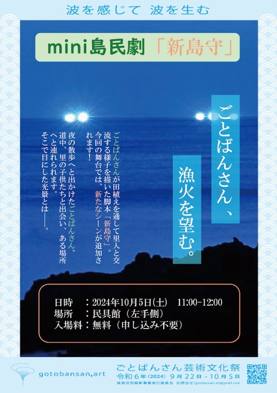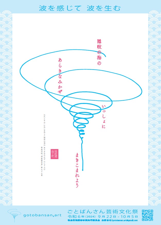 後鳥羽院顕彰事業実行委員会(委員長:大江和彦海士町長)では、令和6年9月22日(日)から10月5日(土)にわたり、「ごとばんさん芸術文化祭」を開催します。実行委員会では、後鳥羽院遷幸800年からの次のステップとして、「ごとばんさん(後鳥羽院)」に代表される海士町の文化を未来に残すために、新たな形で生み出し、伝えていく「ごとばんさん芸術文化祭」を昨年から開催しています。