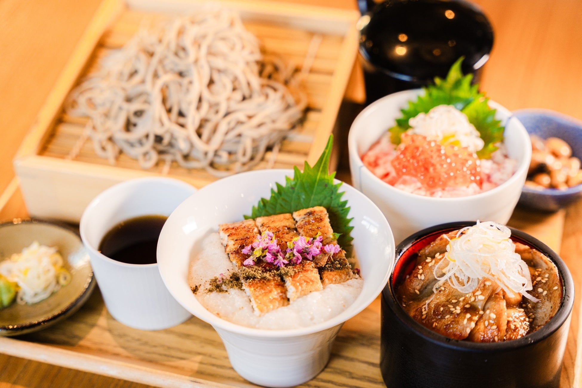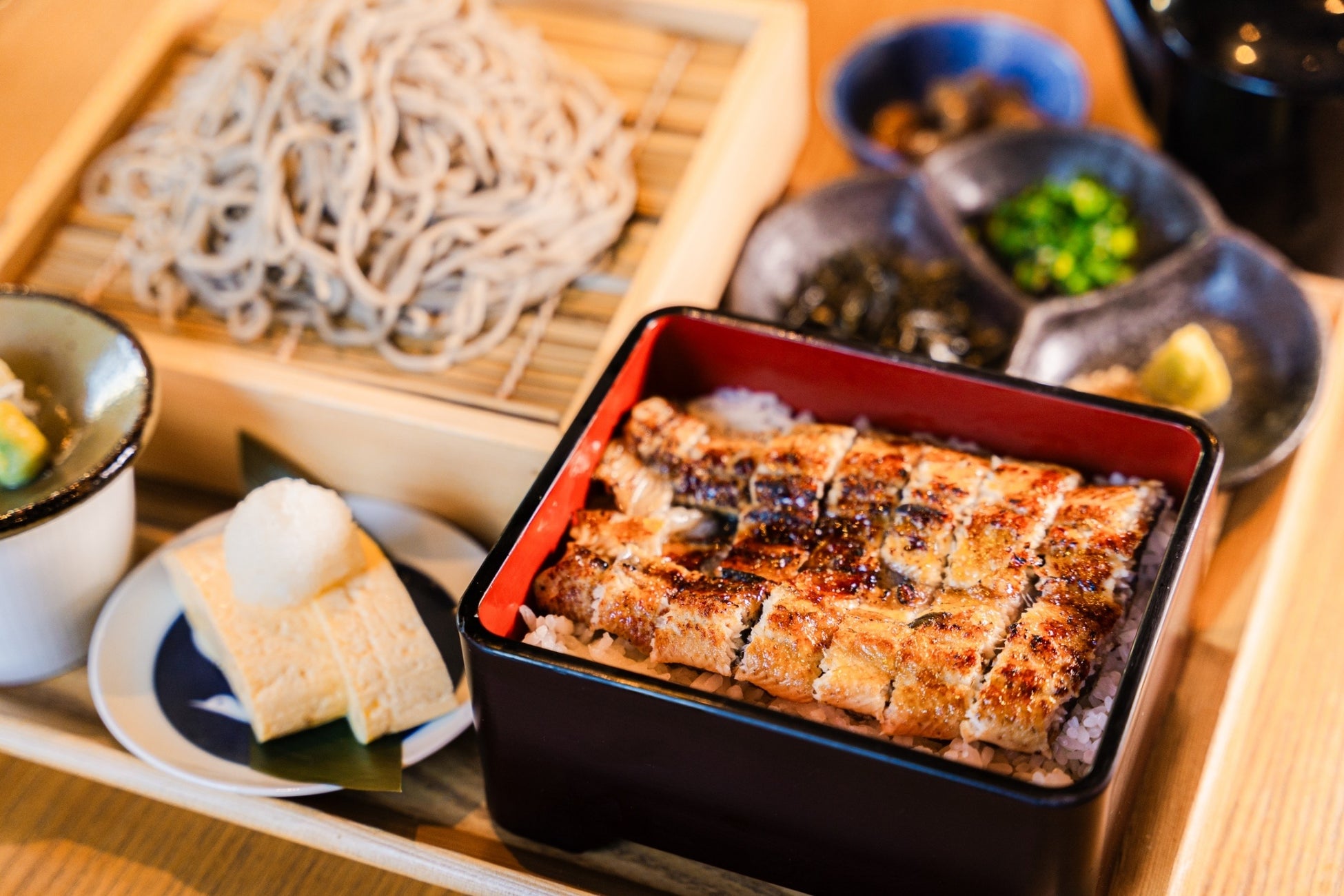 ふっくらと黄金色に焼き上げた鰻を贅沢にのせたうな重と三ノ汁自慢のざる蕎麦のセット御前。