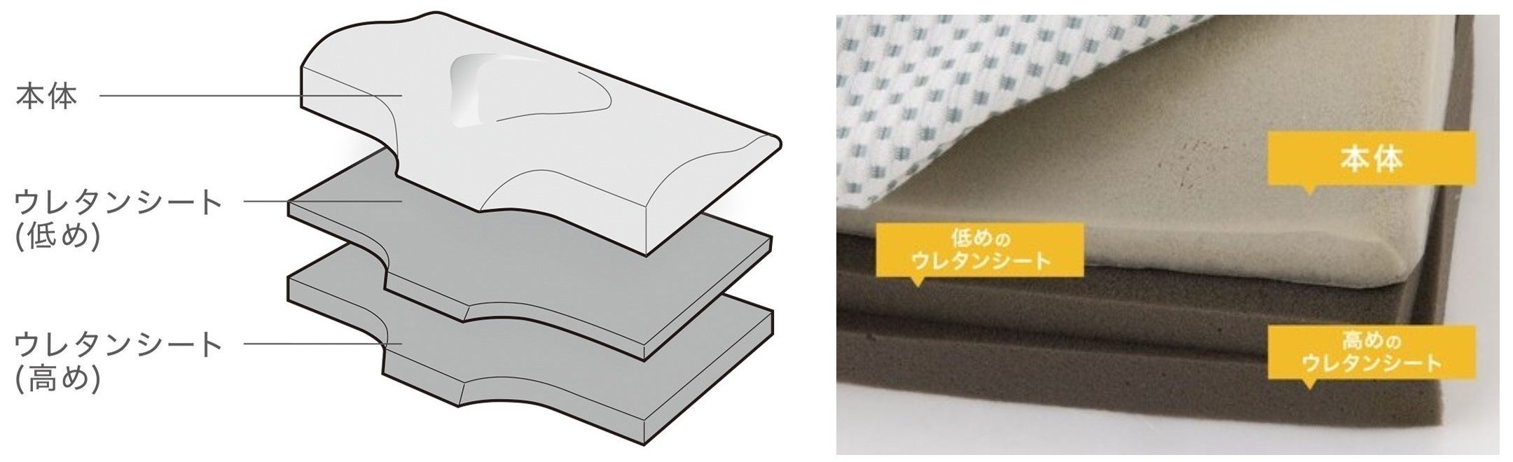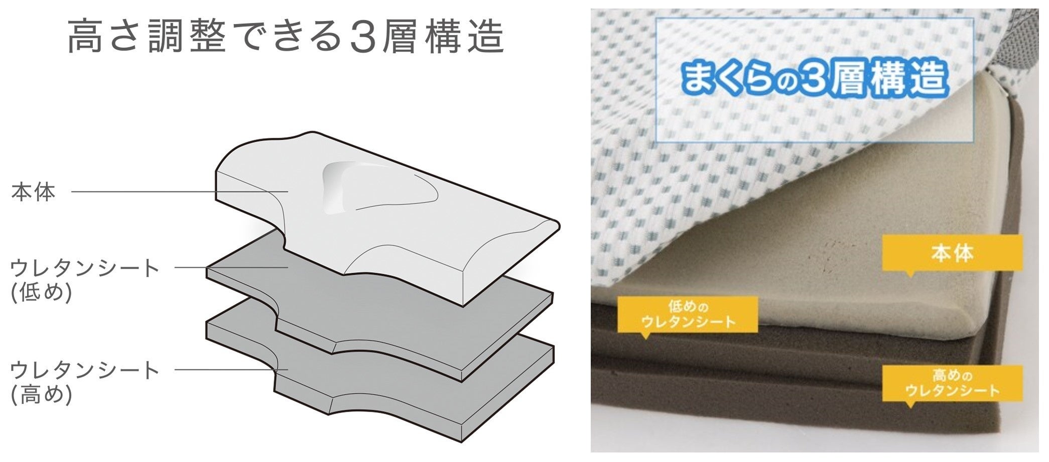 4月11日よりTVCM放映予定の「横向き寝がラクなまくら」は年間販売数16万個の大人気枕です。頭にフィットする特殊な形状の枕で、横向きに導きやすい構造になっており、横向きで寝た時の身体の負担を少なくし、自然な姿勢を保ちます。もちろん、仰向けでも独特のくぼみが首元にフィットするため、快適に眠ることができます。また、中身の2枚のウレタンシートを抜き差しすることで4通りの高さに調整が可能となり、体型問わず心地よくお使いいただけます。「横向き寝がラクなまくら」は、いびきにお困りの方にぴったりのアイテムです。