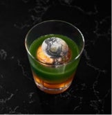 これらの交差する偶然(=コネクション)から得たインスピレーションをもとに、今や世界で愛される抹茶をレシピの主役に、和と洋の邂逅を思わせる二層からなるカクテルが考案されました。上層の濃い常盤緑には、オーガニック茶葉から作られる「CUZEN MATCHA(空禅抹茶)」を使用。通常は味わうことの難しい“挽きたて”抹茶の香りと鮮やかな風味が楽しめます。そこに、ドイツの老舗自然食品メーカー「ザイテンバッハ」のプロテインが重なり、上品でユニークなハーモニーを奏でます。下層のローズカラーは、京都蒸溜所の日本産プレステージジン「季の美 京都ドライジン」と、梅のリキュール「季の梅」で構成。和のナチュラルな素材が、京都を発祥の地とする狩野派の自然への美意識と重なります。仕上げに舞うウエハーペーパーには、メトロポリタン美術館に収蔵されている狩野山雪の傑作《老梅図襖》が描かれ、再生の象徴である梅の木がバッハと重三郎のつながりをほのめかすように浮かび上がります。