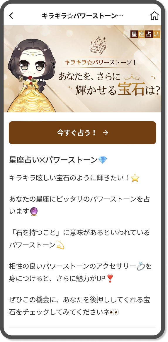 今回リリースされた「キラキラ☆パワーストーン! あなたをさらに輝かせる宝石は?」 では、星座占いで、自分の星座にピッタリのパワーストーンを占うことができます。
