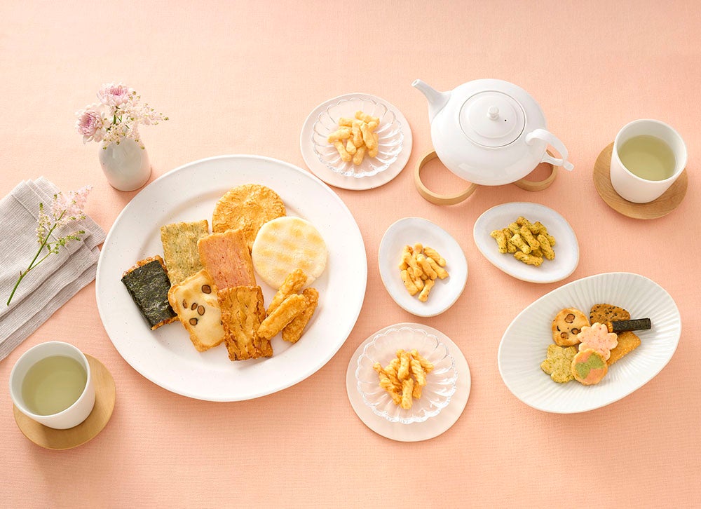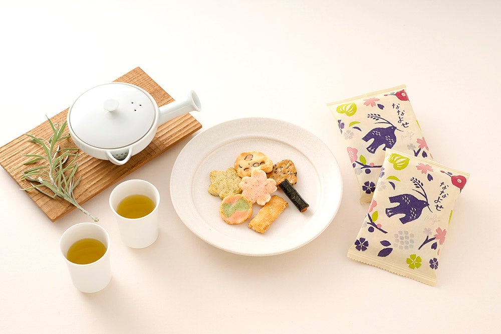 1袋で7種類のあられ・おせんべいを楽しめる人気商品。今回のリニューアルでは、より日本の美しい四季の情景や自然の恵みを米菓でお楽しみいただけるよう、素材や味わい、季節を感じられる形にこだわり、新しくセレクトしました。『ななよせ』のラインナップは全部で5種類。