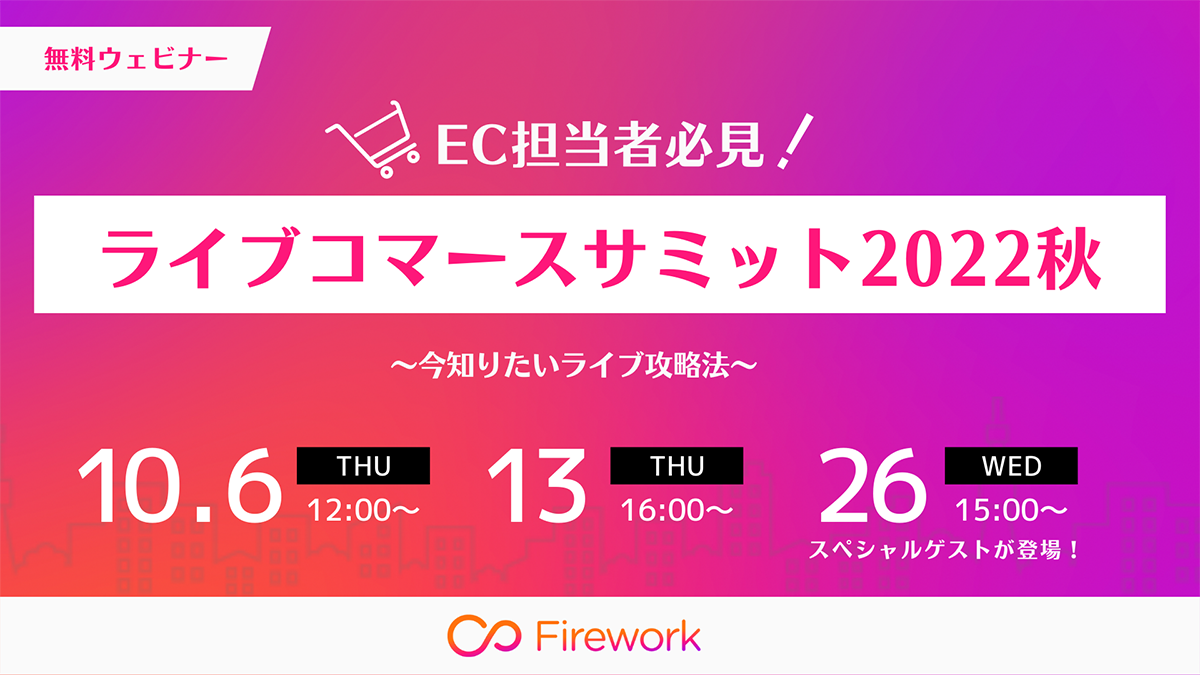 この度動画DXプラットフォームのFireworkは、ライブコマースサミット2022秋〜今知りたいライブ攻略法〜と題し、全3弾にわたり無料ウェビナーを開催いたします。EC業界においてバズワードにもなっているライブコマース。これまで数多くのブランド様のライブコマースのお取り組みをサポートしてきた経験を元に、顧客の心を掴みEC売上の拡大に寄与するライブコマースの攻略方法をお伝えします。