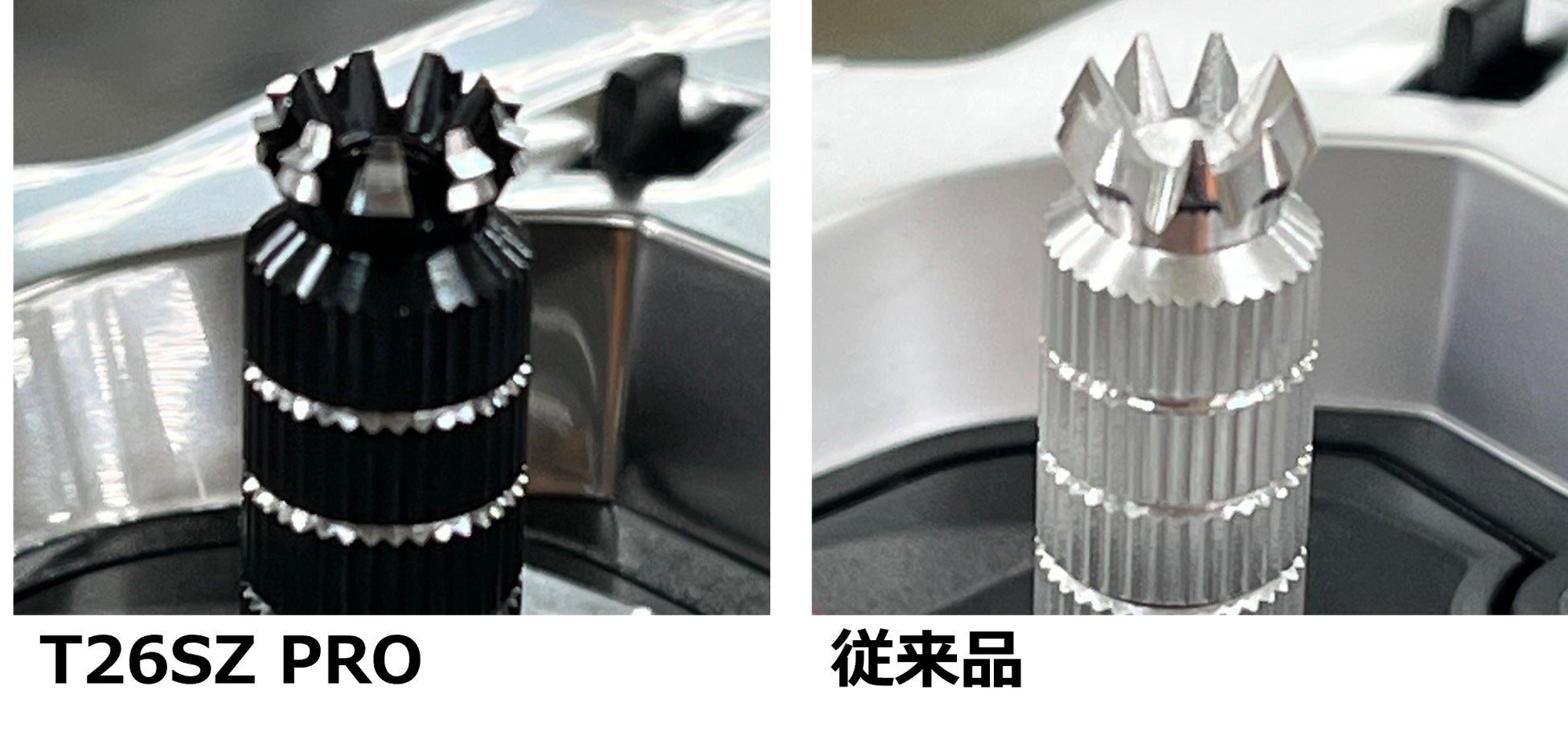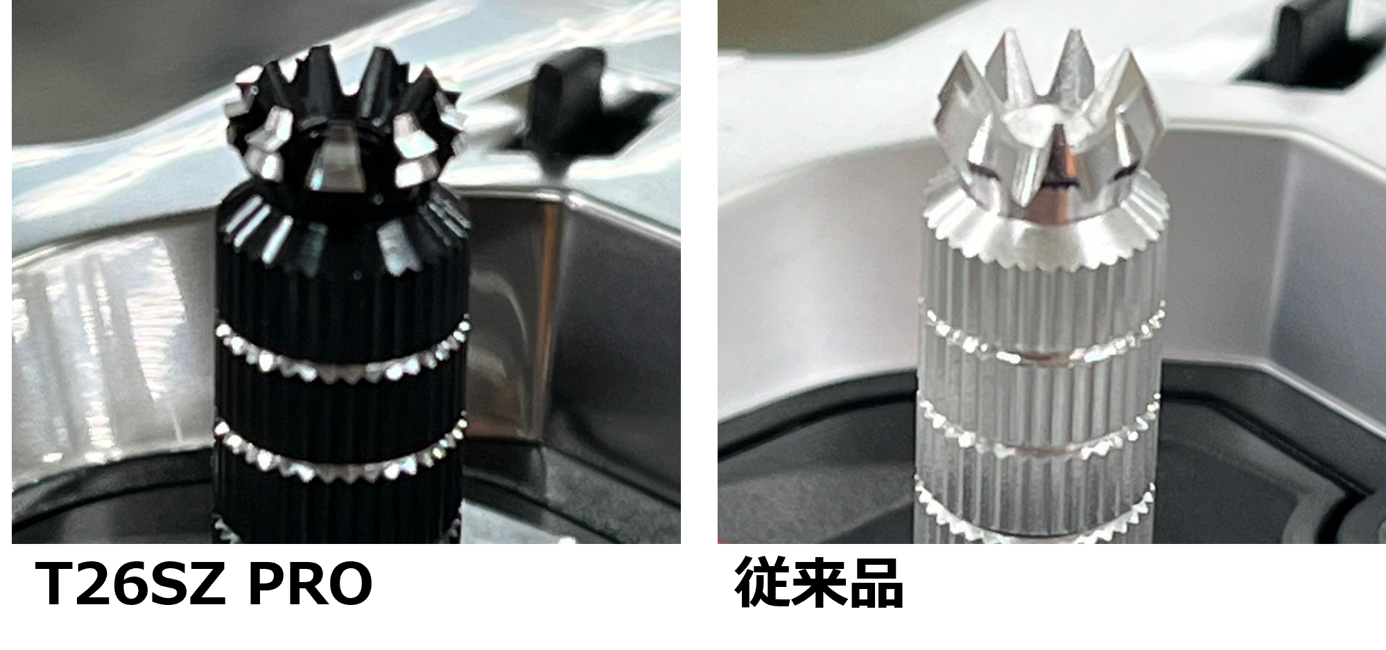 ブラック・アルマイトを使用することによる全体との調和による高級感の向上と、先端形状変更による、操作時の指の滑り防止。