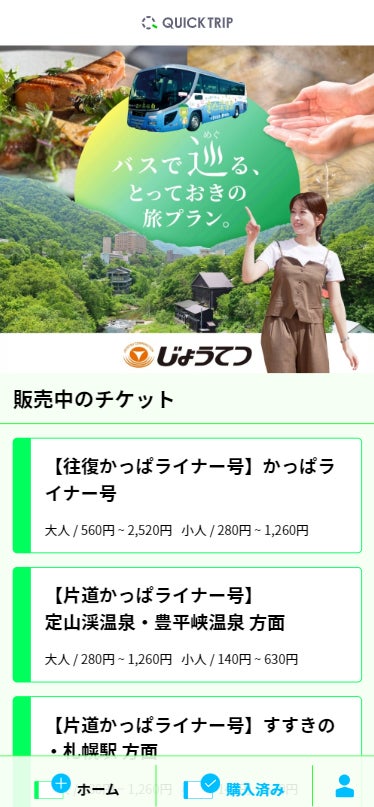 レシップホールディングス株式会社(本社:岐阜県本巣市、代表取締役社長:杉本 眞)の連結子会社レシップ株式会社は、2025年7月1日(火)より、観光・イベント向けモバイルチケットシステム「QUICK TRIP Ticket」を活用し、株式会社じょうてつ(本社:北海道札幌市、代表取締役社長:高木 克典)が販売する「かっぱライナー号」のバスチケットおよび同バスを利用した定山渓エリアのアクティビティプランのチケットの取扱いを開始しました。