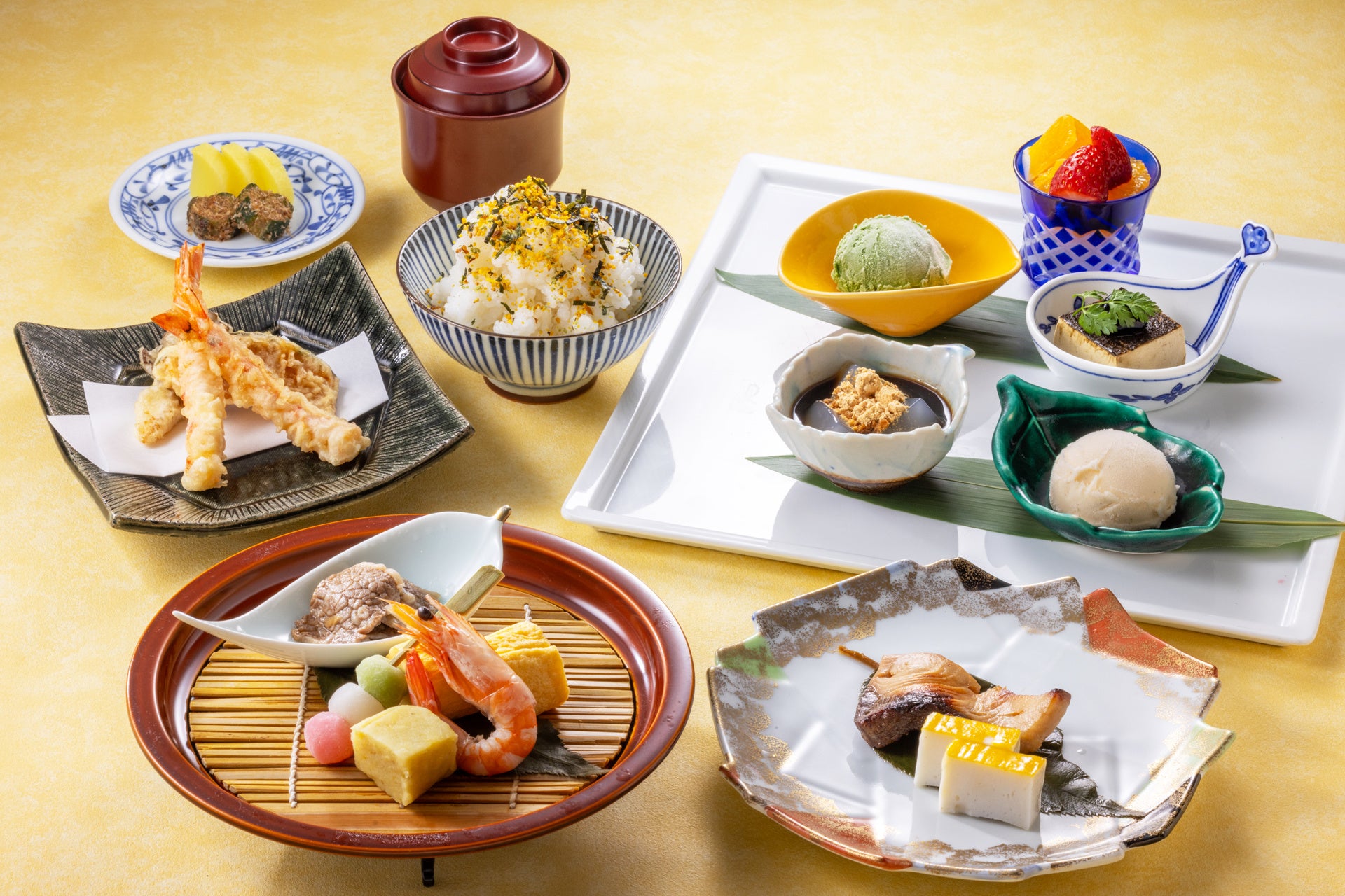 メニュー:先付盛り合わせ、焼物、天ぷら、季節の御飯・赤出汁・香物、甘味