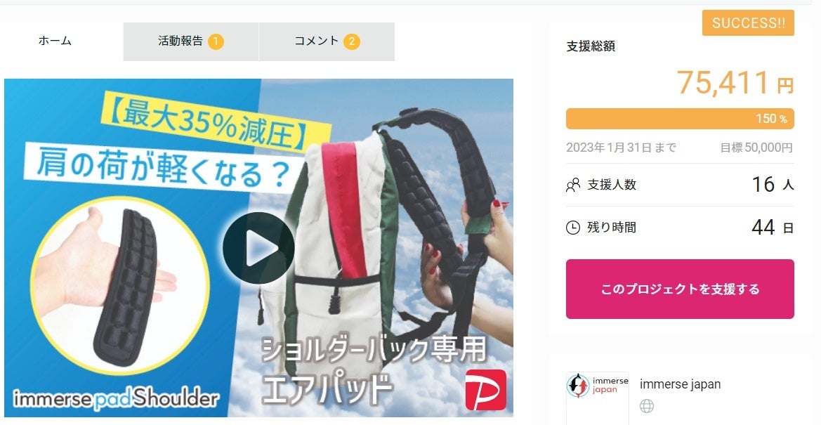 株式会社immerse japanは、クラウドファンディングプラットフォームGreenfunding(グリーンファンディング)で実施している新商品immersepad shoulder(イマースパッドショルダー)発売クラウドファンディングの支援金が目標を達成しことをお知らせします。