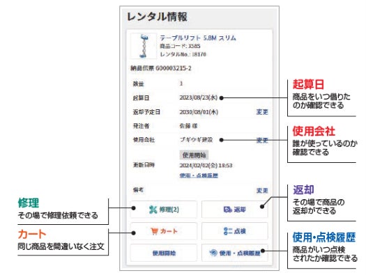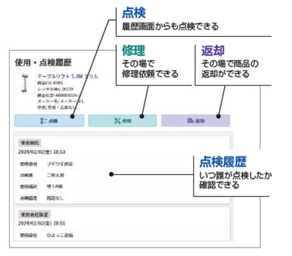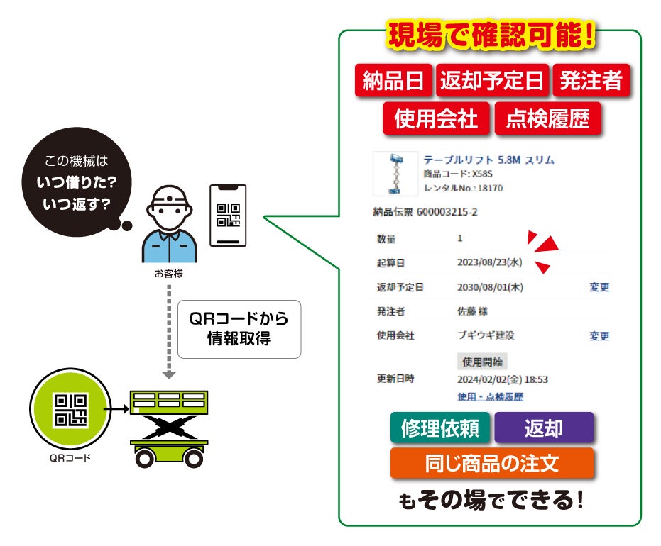 従来、パトロールや巡回の際、目の前の機械を誰が管理しているかを確認するためには電話連絡や、事務所に戻りパソコンから確認を行うなどといった多くの手間と時間を要していました。そんなお客様の「困った」を解決すべく、この新機能では、機械に貼付けられたQRコードをスマホなどで読み取るだけで、これらの情報を機械の目の前にいながらダイレクトに確認する事ができ、更にその場で修理や返却の手続き、点検の記録を辿る事も可能になりました。