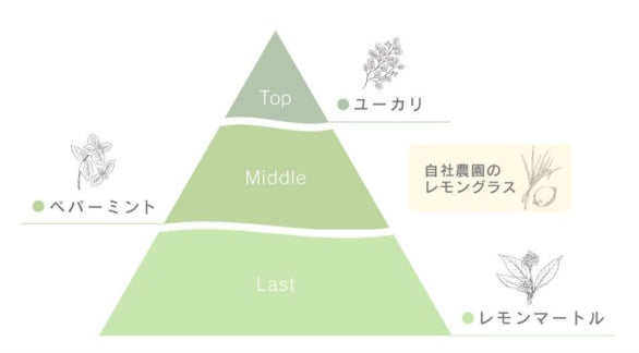 ユーカリの穏やかな清々しさからペパーミントとレモンマートルで爽やかさを加えた清涼感のあるシトラス系の香り。