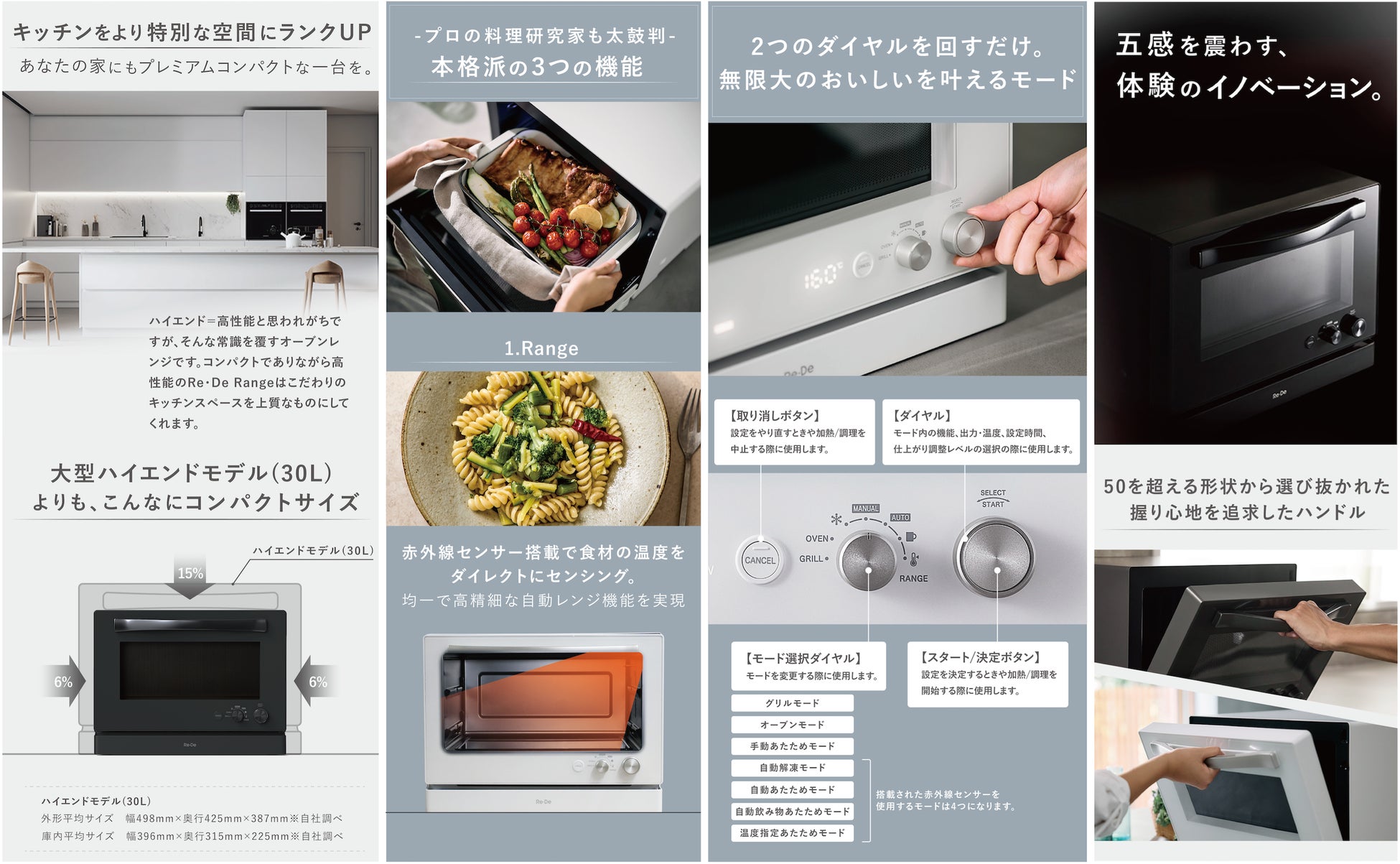 大型で高機能な製品が主流なオーブンレンジ市場で、都市部を中心に増加している単身世帯や少人数の家族向けに、高品質でありながら、コンパクトなオーブンレンジの潜在的なニーズがあることに着目し、Re・De Rangeは開発されました。限られたスペースでも、最大限の機能性と美しさを実現することを目指し、洗練されたデザインと、高い調理機能を兼ね備えた新しいカテゴリーを提案することで、「心地をリデザインするウェルネスブランド」というRe・Deのコンセプトを体現し、これまでにない、「小型ハイエンドオーブンレンジ」という新しい選択肢を提案します。