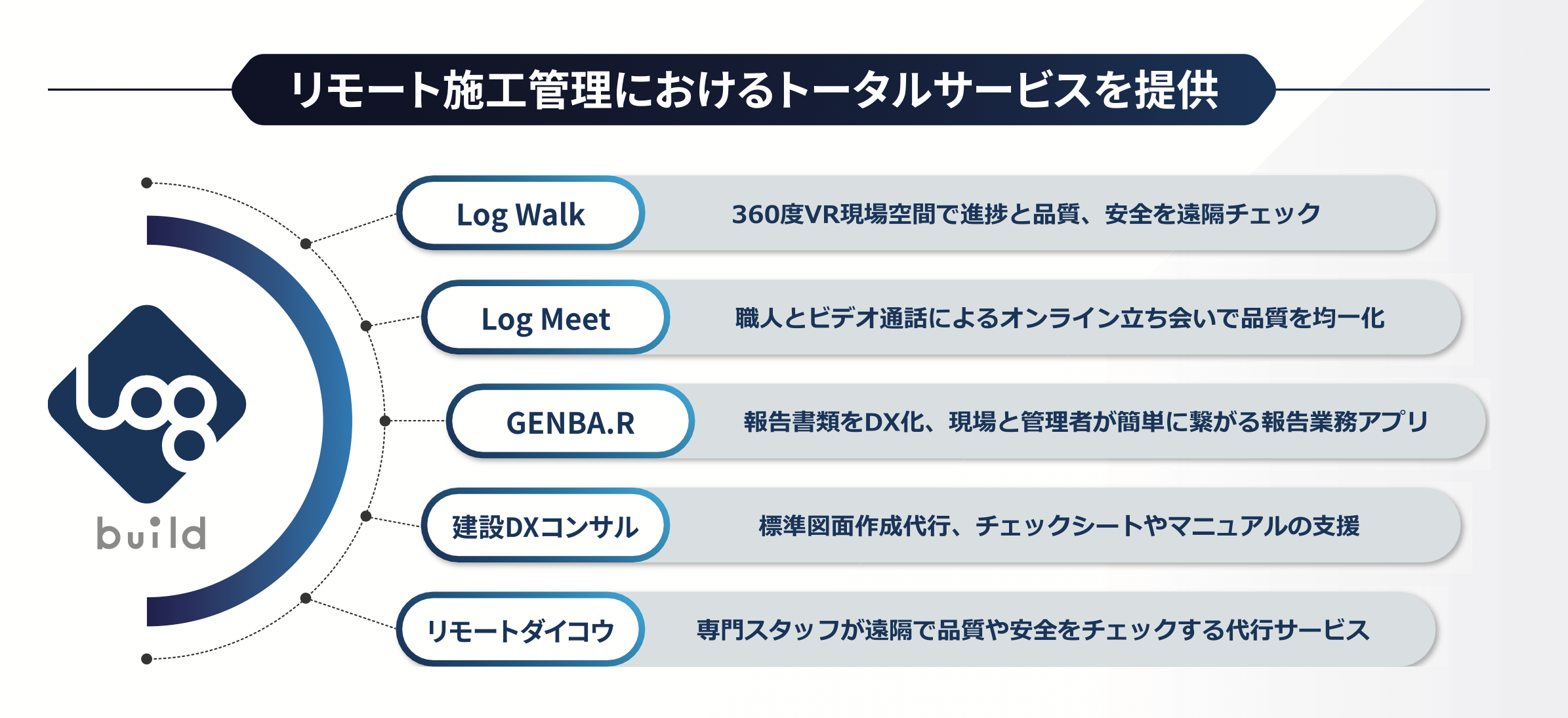 ※日本初:「VR現場空間」「ビデオ通話による遠隔立会い」「標準図面の作成代行」「リモート現場管理代行」「DXコンサル」など、遠隔施工管理に必要なすべてのサービスを提供する企業として、日本初(自社調べ、2024年10月時点)。