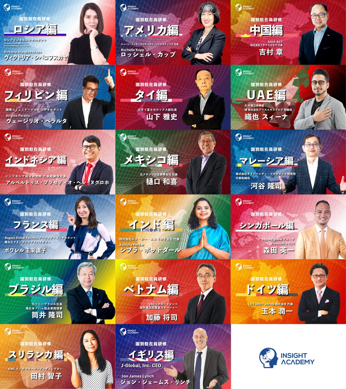INSIGHT ACADEMYの国別駐在員研修シリーズは、対象国でのビジネス経験が豊富なプロフェッショナルを講師に迎え、海外駐在予定者・駐在間もない⽅、また国内海外事業従事者を対象に、現地スタッフと信頼関係を築いて成果を出す、というテーマでデザインされた講座です。