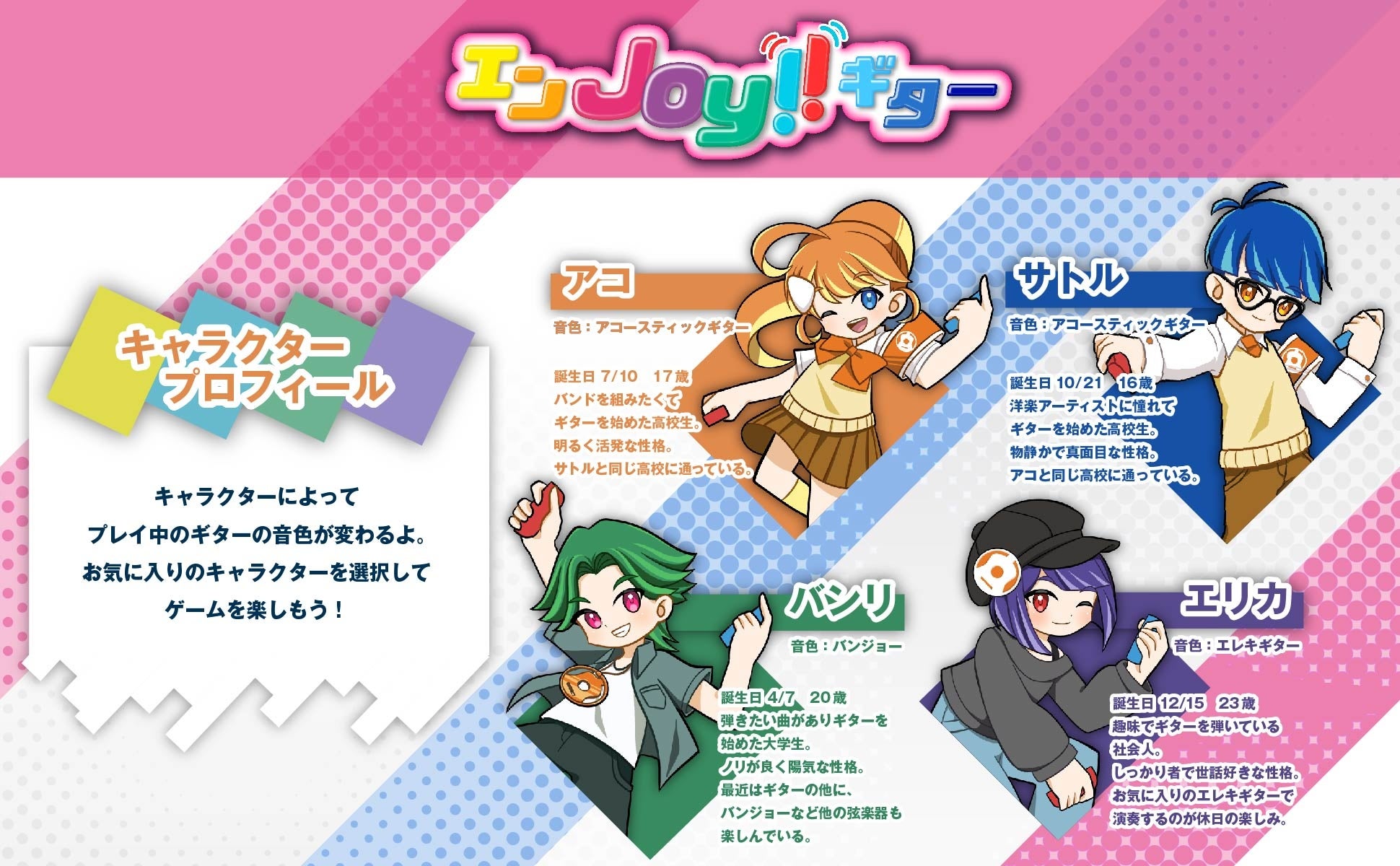 キャラクターによってプレイ中のギターの音色が変わり、お気に入りのキャラクターを選択してゲームをお楽しみ頂けます。
